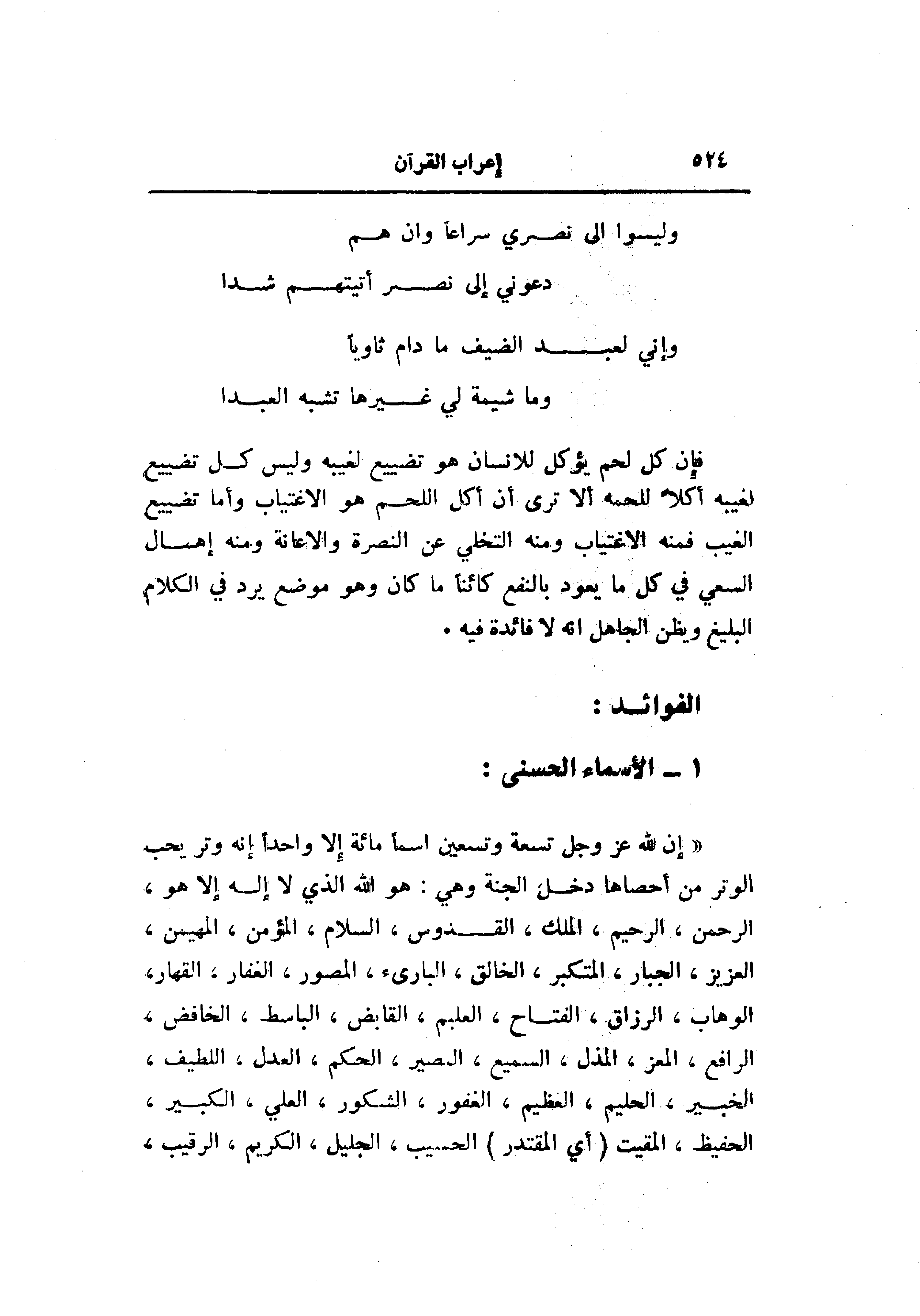 «إن لله عز وجل تسعة وتسعين اسما مائة إلا واحدا إنه وتر يحب الوتر من أحصاها دخل الجنة وهي: هو الله الذي لا إله إلا هو، الرحمن، الرحيم، الملك، القدوس، السلام، المؤمن، المهيمن، العزيز، الجبار، المتكبر، الخالق، البارئ، المصور، الغفار، القهار، الوهاب، الرزاق، الفتاح، العليم، القابض، الباسط، الخافض، الرافع، المعز، المذل، السميع، البصير، الحكم، العدل، اللطيف، الخبير، الحليم، العظيم، الغفور، الشكور، العلي، الكبير، الحفيظ، المقيت (أي المقتدر) الحسيب، الجليل، الكريم، الرقيب،