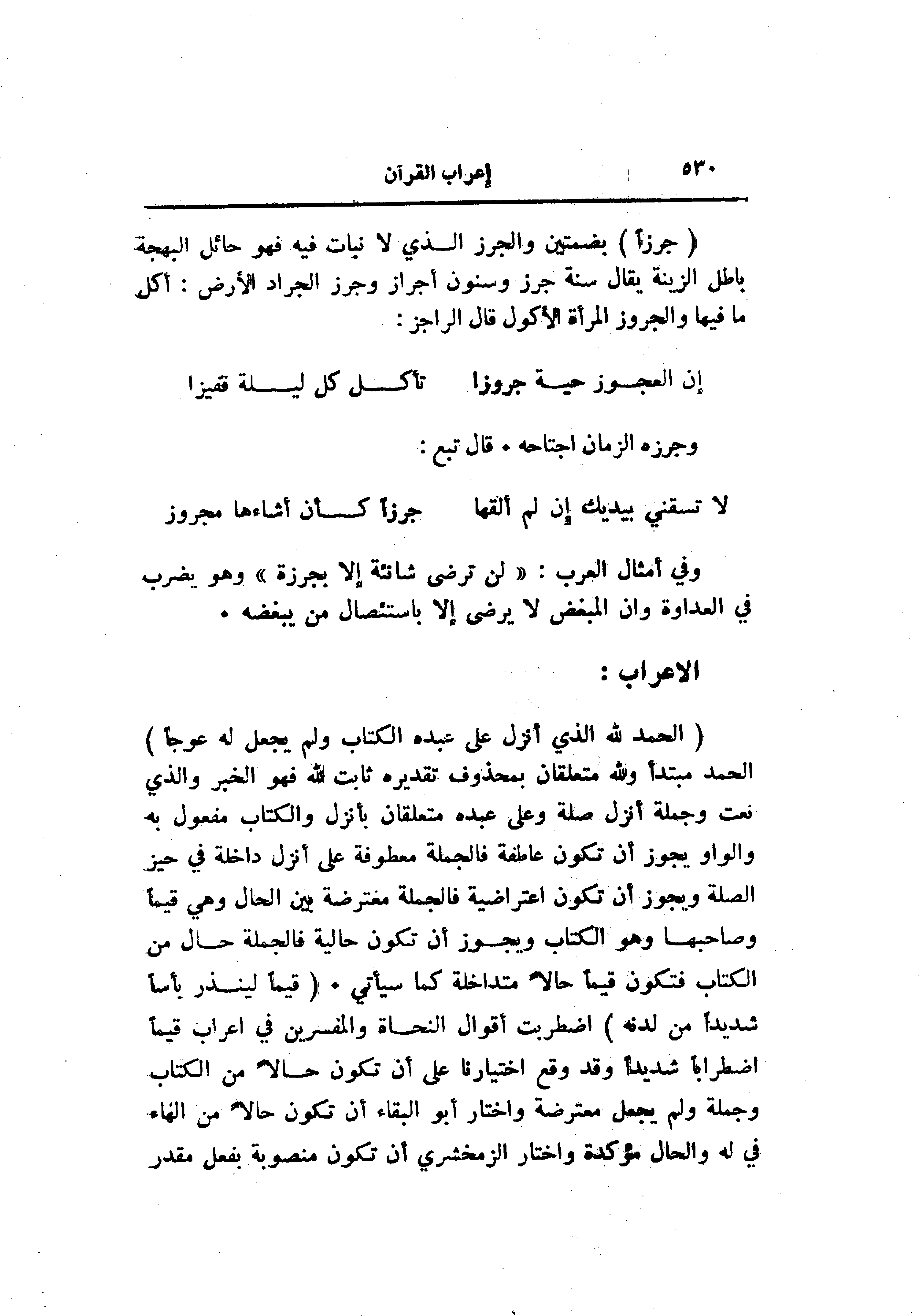 (الْحَمْدُ لِلَّهِ الَّذِي أَنْزَلَ عَلى عَبْدِهِ الْكِتابَ وَلَمْ يَجْعَلْ لَهُ عِوَجاً) الحمد مبتدأ ولله متعلقان بمحذوف تقديره ثابت لله فهو الخبر والذي نعت وجملة أنزل صلة وعلى عبده متعلقان بأنزل والكتاب مفعول به والواو يجوز أن تكون عاطفة فالجملة معطوفة على أنزل داخلة في حيز الصلة ويجوز أن تكون اعتراضية فالجملة معترضة بين الحال وهي قيما وصاحبها وهو الكتاب ويجوز أن تكون حالية فالجملة حال من الكتاب فتكون قيما حالا متداخلة كما سيأتي. (قَيِّماً لِيُنْذِرَ بَأْساً شَدِيداً مِنْ لَدُنْهُ) اضطربت أقوال النحاة والمفسرين في اعراب قيما اضطرابا شديدا وقد وقع اختيارنا على أن تكون حالا من الكتاب وجملة ولم يجعل معترضة واختار أبو البقاء أن تكون حالا من الهاء في له والحال مؤكدة واختار الزمخشري أن تكون منصوبة بفعل مقدر