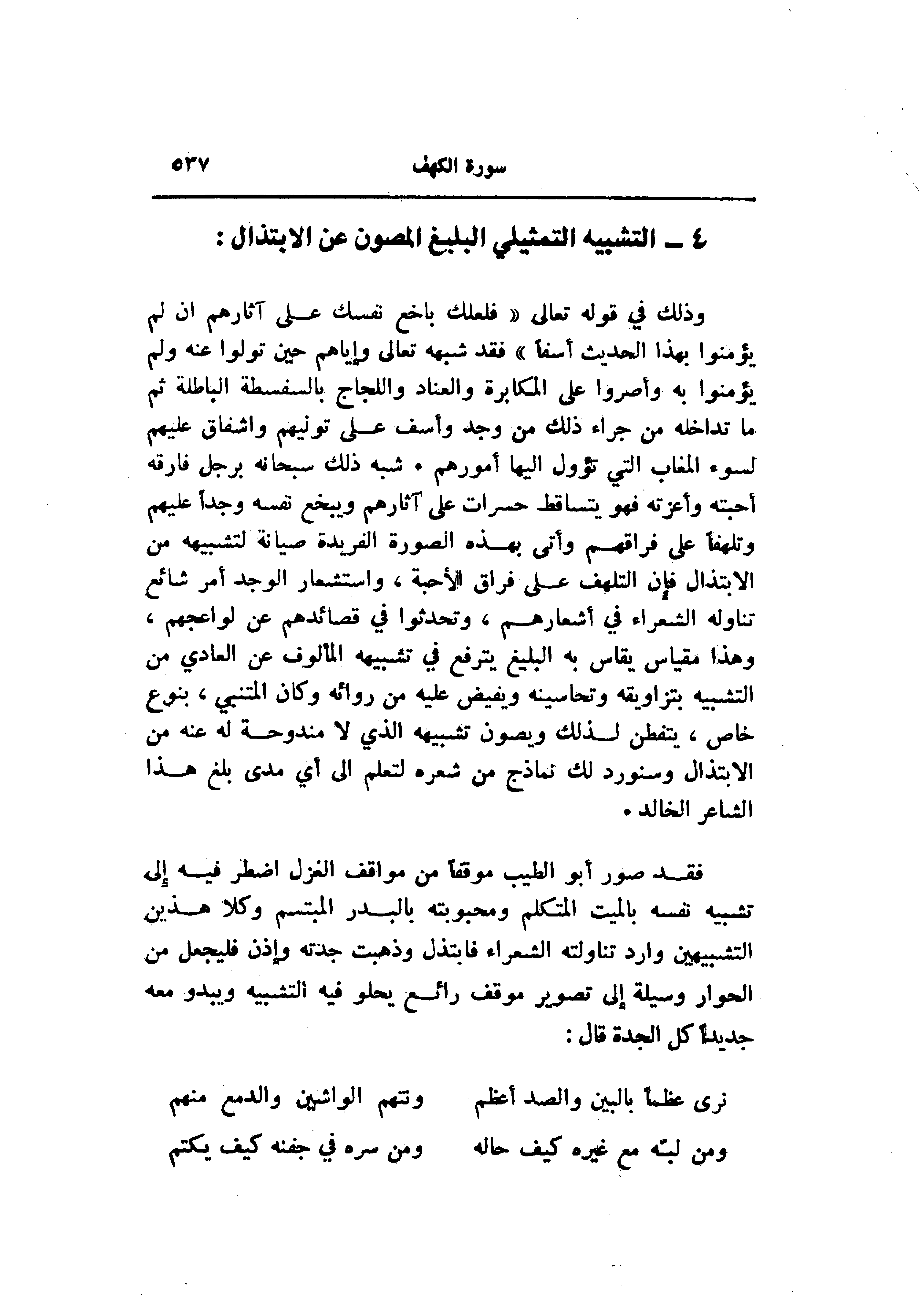 وذلك في قوله تعالى «فلعلك باخع نفسك على آثارهم ان لم يؤمنوا بهذا الحديث أسفا» فقد شبهه تعالى وإياهم حين تولوا عنه ولم يؤمنوا به وأصروا على المكابرة والعناد واللجاج بالسفسطة الباطلة ثم ما تداخله من جراء ذلك من وجد وأسف على توليهم وإشفاق عليهم لسوء المغاب التي تؤول إليها أمورهم. شبه ذلك سبحانه برجل فارقه أحبته وأعزته فهو يتساقط حسرات على آثارهم ويبخع نفسه وجدا عليهم وتلهفا على فراقهم وأتى بهذه الصورة الفريدة صيانة لتشبيهه من الابتذال فإن التلهف على فراق الأحبة، واستشعار الوجد أمر شائع تناوله الشعراء في أشعارهم، وتحدثوا في قصائدهم عن لواعجهم، وهذا مقياس يقاس به البليغ يترفع في تشبيهه المألوف عن العادي من التشبيه بتزاويقه وتحاسينه ويفيض عليه من روائه وكان المتنبي، بنوع خاص، يتفطن لذلك ويصون تشبيهه الذي لا مندوحة له عنه من الابتذال وسنورد لك نماذج من شعره لتعلم الى أي مدى بلغ هذا الشاعر الخالد.