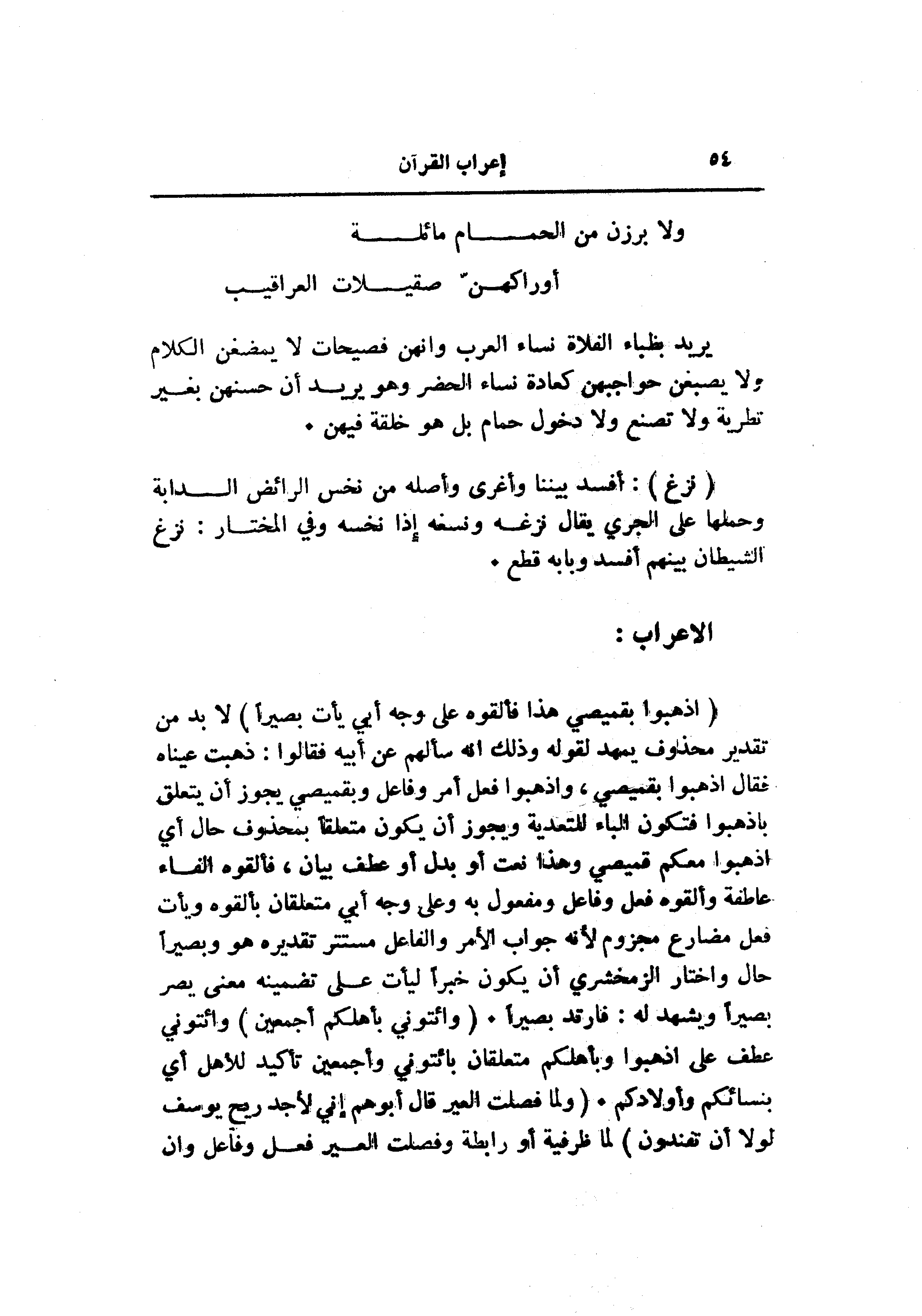 (اذْهَبُوا بِقَمِيصِي هذا فَأَلْقُوهُ عَلى وَجْهِ أَبِي يَأْتِ بَصِيراً) لا بد من تقدير محذوف يمهد لقوله وذلك انه سألهم عن أبيه فقالوا: ذهبت عيناه فقال اذهبوا بقميصي، واذهبوا فعل أمر وفاعل وبقميصي يجوز أن يتعلق باذهبوا فتكون الباء للتعدية ويجوز أن يكون متعلقا بمحذوف حال أي اذهبوا معكم قميصي وهذا نعت أو بدل أو عطف بيان، فألقوه الفاء عاطفة وألقوه فعل وفاعل ومفعول به وعلى وجه أبي متعلقان بألقوه ويأت فعل مضارع مجزوم لأنه جواب الأمر والفاعل مستتر تقديره هو وبصيرا حال واختار الزمخشري أن يكون خبرا ليأت على تضمينه معنى يصر بصيرا ويشهد له: فارتد بصيرا. (وَأْتُونِي بِأَهْلِكُمْ أَجْمَعِينَ) وائتوني عطف على اذهبوا وبأهلكم متعلقان بائتوني وأجمعين تأكيد للأهل أي بنسائكم وأولادكم. (وَلَمَّا فَصَلَتِ الْعِيرُ قالَ أَبُوهُمْ إِنِّي لَأَجِدُ رِيحَ يُوسُفَ لَوْلا أَنْ تُفَنِّدُونِ) لما ظرفية أو رابطة وفصلت العير فعل وفاعل وان