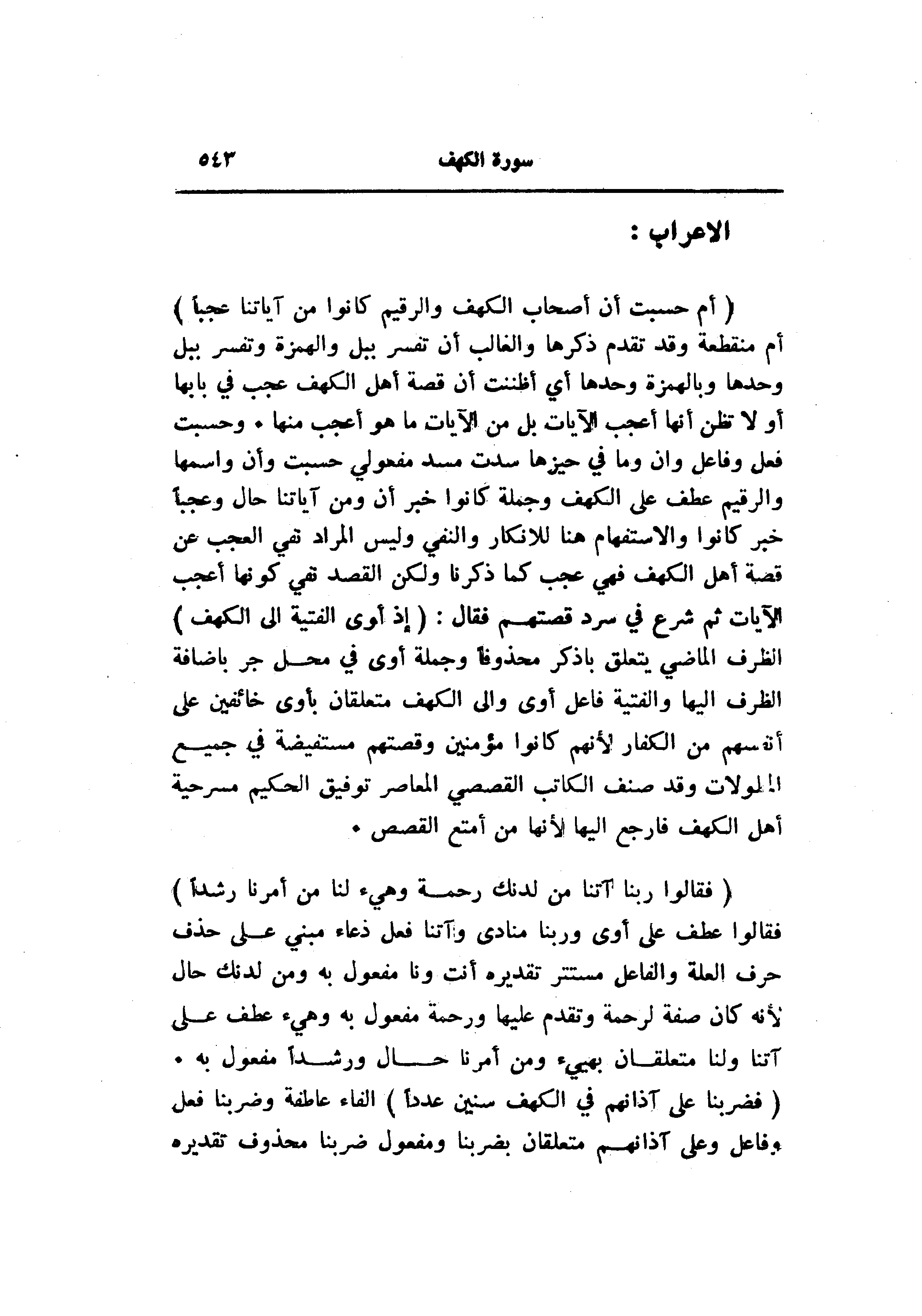 (أَمْ حَسِبْتَ أَنَّ أَصْحابَ الْكَهْفِ وَالرَّقِيمِ كانُوا مِنْ آياتِنا عَجَباً) أم منقطعة وقد تقدم ذكرها والغالب أن تفسر ببل والهمزة وتفسر ببل وحدها وبالهمزة وحدها أي أظننت أن قصة أهل الكهف عجب في بابها أو لا تظن أنها أعجب الآيات بل من الآيات ما هو أعجب منها. وحسبت فعل وفاعل وان وما في حيزها سدت مسد مفعولي حسبت وأن واسمها والرقيم عطف على الكهف وجملة كانوا خبر أن ومن آياتنا حال وعجبا خبر كانوا والاستفهام هنا للانكار والنفي وليس المراد نفي العجب عن قصة أهل الكهف فهي عجب كما ذكرنا ولكن القصد نفي كونها أعجب الآيات ثم شرع في سرد قصتهم فقال: (إِذْ أَوَى الْفِتْيَةُ إِلَى الْكَهْفِ) الظرف الماضي يتعلق باذكر محذوفا وجملة أوى في محل جر باضافة الظرف إليها والفتية فاعل أوى والى الكهف متعلقان بأوى خائفين على أنفسهم من الكفار لأنهم كانوا مؤمنين وقصتهم مستفيضة في جميع المطولات وقد صنف الكاتب القصصي المعاصر توفيق الحكيم مسرحية أهل الكهف فارجع إليها لأنها من أمتع القصص.