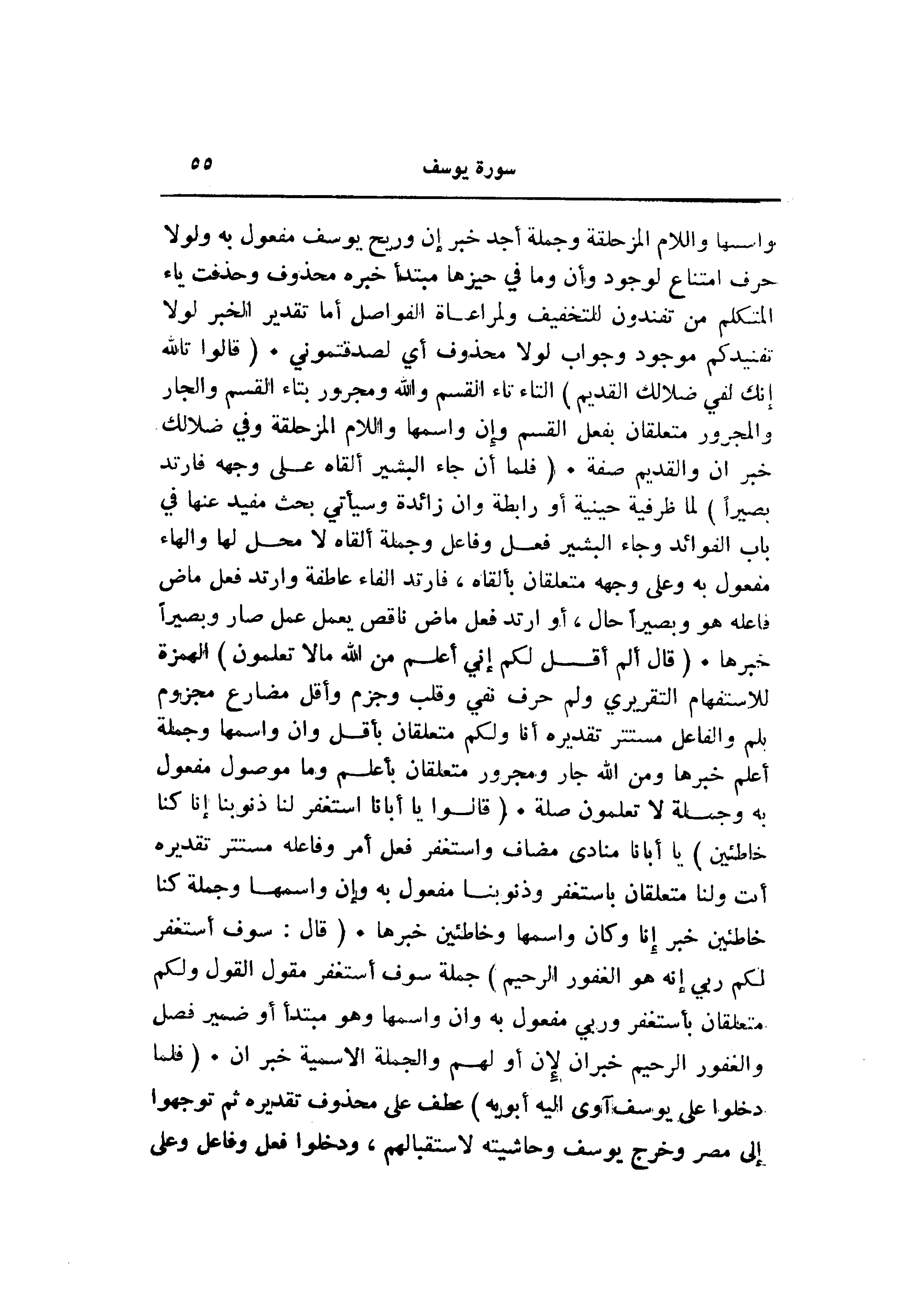 واسمها واللام المزحلقة وجملة أجد خبر إن وريح يوسف مفعول به ولولا حرف امتناع لوجود وأن وما في حيزها مبتدأ خبره محذوف وحذفت ياء المتكلم من تفندون للتخفيف ولمراعاة الفواصل أما تقدير الخبر لولا تفنيدكم موجود وجواب لولا محذوف أي لصدقتموني. (قالُوا تَاللَّهِ إِنَّكَ لَفِي ضَلالِكَ الْقَدِيمِ) التاء تاء القسم والله ومجرور بتاء القسم والجار والمجرور متعلقان بفعل القسم وإن واسمها واللام المزحلقة وفي ضلالك خبر ان والقديم صفة. (فَلَمَّا أَنْ جاءَ الْبَشِيرُ أَلْقاهُ عَلى وَجْهِهِ فَارْتَدَّ بَصِيراً) لما ظرفية حينية أو رابطة وان زائدة وسيأتي بحث مفيد عنها في باب الفوائد وجاء البشير فعل وفاعل وجملة ألقاه لا محل لها والهاء مفعول به وعلى وجهه متعلقان بألقاه، فارتد الفاء عاطفة وارتد فعل ماض فاعله هو وبصيرا حال، أو ارتد فعل ماض ناقص يعمل عمل صار وبصيرا خبرها. (قالَ أَلَمْ أَقُلْ لَكُمْ إِنِّي أَعْلَمُ مِنَ اللَّهِ ما لا تَعْلَمُونَ) الهمزة للاستفهام التقريري ولم حرف نفي وقلب وجزم وأقل مضارع مجزوم بلم والفاعل مستتر تقديره أنا ولكم متعلقان بأقل وان واسمها وجملة أعلم خبرها ومن الله جار ومجرور متعلقان بأعلم وما موصول مفعول به وجملة لا تعلمون صلة. (قالُوا يا أَبانَا اسْتَغْفِرْ لَنا ذُنُوبَنا إِنَّا كُنَّا خاطِئِينَ) يا أبانا منادى مضاف واستغفر فعل أمر وفاعله مستتر تقديره أنت ولنا متعلقان باستغفر وذنوبنا مفعول به وإن واسمها وجملة كنا خاطئين خبر إنا وكان واسمها وخاطئين خبرها. (قالَ: سَوْفَ أَسْتَغْفِرُ لَكُمْ رَبِّي إِنَّهُ هُوَ الْغَفُورُ الرَّحِيمُ) جملة سوف أستغفر مقول القول ولكم متعلقان بأستغفر وربي مفعول به وان واسمها وهو مبتدأ أو ضمير فصل والغفور الرحيم خبران لإن أو لهم والجملة الاسمية خبر ان. (فَلَمَّا دَخَلُوا عَلى يُوسُفَ آوى إِلَيْهِ أَبَوَيْهِ) عطف على محذوف تقديره ثم توجهوا إلى مصر وخرج يوسف وحاشيته لاستقبالهم، ودخلوا فعل وفاعل وعلى
