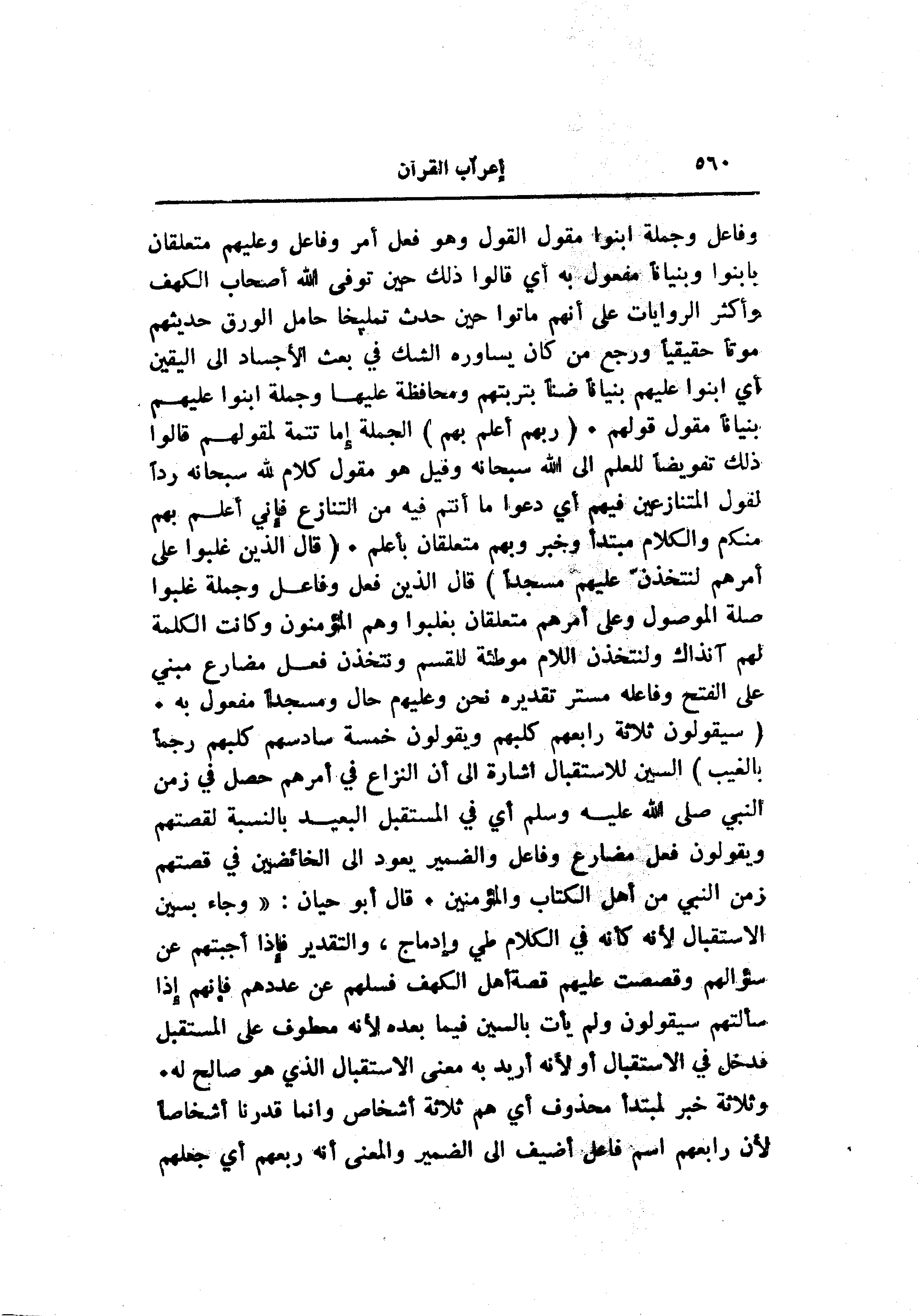 وفاعل وجملة ابنوا مقول القول وهو فعل أمر وفاعل وعليهم متعلقان بابنوا وبنيانا مفعول به أي قالوا ذلك حين توفى الله أصحاب الكهف وأكثر الروايات على أنهم ماتوا حين حدث تمليخا حامل الورق حديثهم موتا حقيقيا ورجع من كان يساوره الشك في بعث الأجساد الى اليقين أي ابنوا عليهم بنيانا ضنا بتربتهم ومحافظة عليها وجملة ابنوا عليهم بنيانا مقول قولهم. (رَبُّهُمْ أَعْلَمُ بِهِمْ) الجملة إما تتمة لمقولهم قالوا ذلك تفويضا للعلم الى الله سبحانه وقيل هو مقول كلام لله سبحانه ردا لقول المتنازعين فيهم أي دعوا ما أنتم فيه من التنازع فإني أعلم بهم منكم والكلام مبتدأ وخبر وبهم متعلقان بأعلم. (قالَ الَّذِينَ غَلَبُوا عَلى أَمْرِهِمْ لَنَتَّخِذَنَّ عَلَيْهِمْ مَسْجِداً) قال الذين فعل وفاعل وجملة غلبوا صلة الموصول وعلى أمرهم متعلقان بغلبوا وهم المؤمنون وكانت الكلمة لهم آنذاك ولنتخذن اللام موطئة للقسم ونتخذن فعل مضارع مبني على الفتح وفاعله مستر تقديره نحن وعليهم حال ومسجدا مفعول به.
