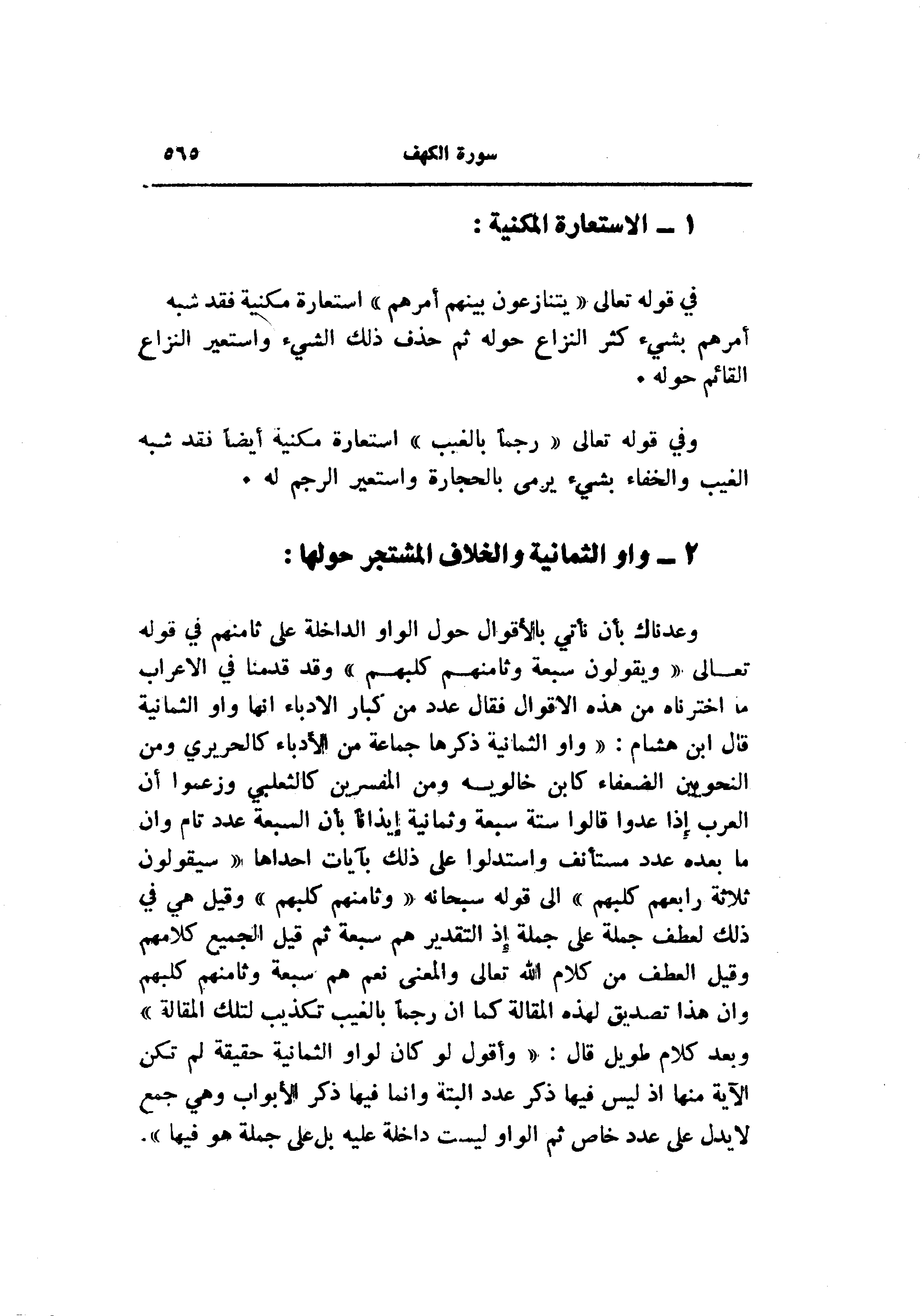 وعدناك بأن نأتي بالأقوال حول الواو الداخلة على ثامنهم في قوله تعالى «ويقولون سبعة وثامنهم كلبهم» وقد قدمنا في الاعراب ما اخترناه من هذه الأقوال فقال عدد من كبار الأدباء انها واو الثمانية قال ابن هشام: «واو الثمانية ذكرها جماعة من الأدباء كالحريري ومن النحويين الضعفاء كابن خالويه ومن المفسرين كالثعلبي وزعموا أن العرب إذا عدوا قالوا ستة سبعة وثمانية إيذانا بأن السبعة عدد تام وان ما بعده عدد مستأنف واستدلوا على ذلك بآيات احداها «سيقولون ثلاثة رابعهم كلبهم» الى قوله سبحانه «وثامنهم كلبهم» وقيل هي في ذلك لعطف جملة على جملة إذ التقدير هم سبعة ثم قيل الجميع كلامهم وقيل العطف من كلام الله تعالى والمعنى نعم هم سبعة وثامنهم كلبهم وان هذا تصديق لهذه المقالة كما ان رجما بالغيب تكذيب لتلك المقالة» وبعد كلام طويل قال: «وأقول لو كان لواو الثمانية حقيقة لم تكن الآية منها إذ ليس فيها ذكر عدد البتة وانما فيها ذكر الأبواب وهي جمع لا يدل على عدد خاص ثم الواو ليست داخلة عليه بل على جملة هو فيها» .