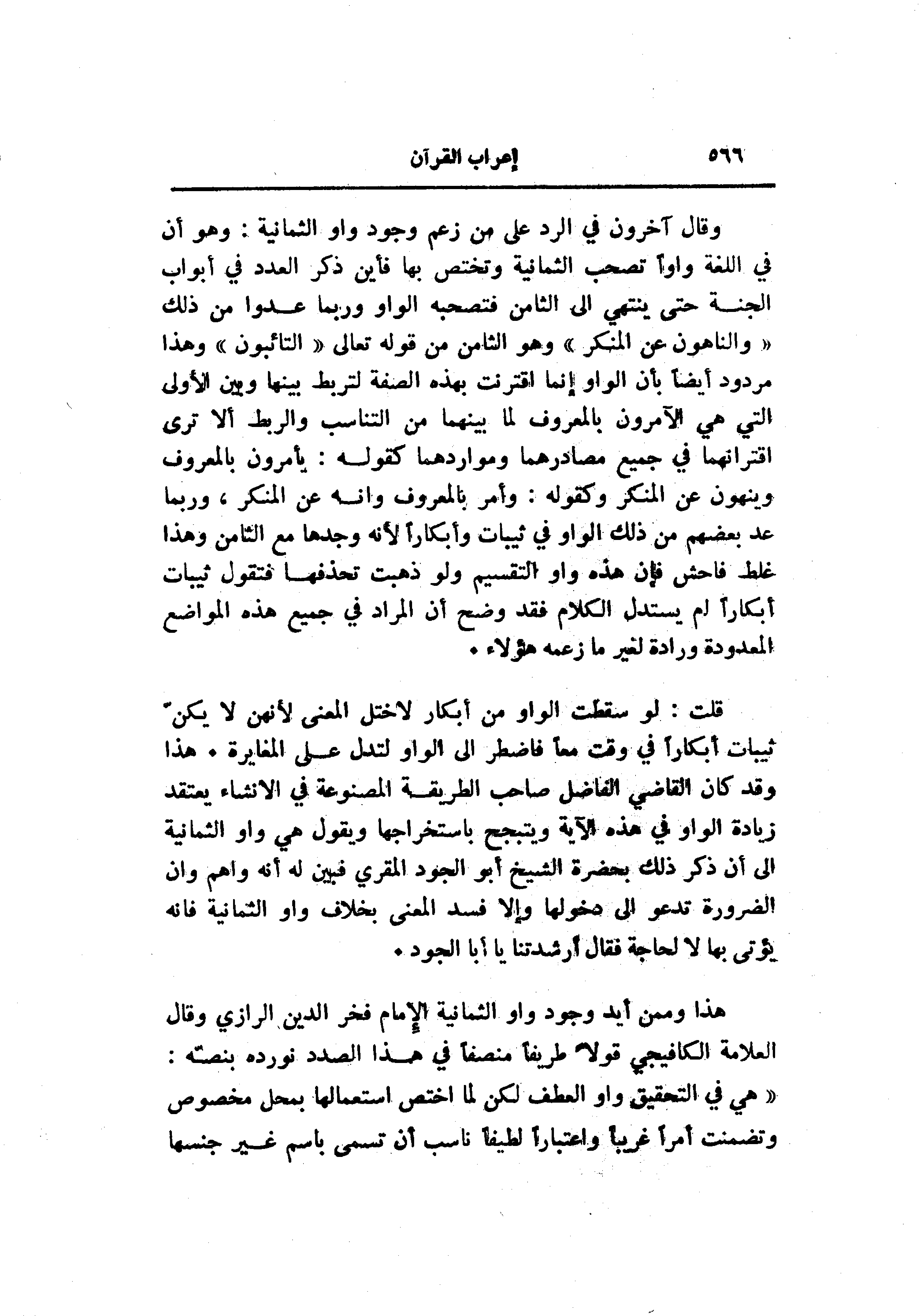 وقال آخرون في الرد على من زعم وجود واو الثمانية: وهو أن في اللغة واوا تصحب الثمانية وتختص بها فأين ذكر العدد في أبواب الجنة حتى ينتهي الى الثامن فتصحبه الواو وربما عدوا من ذلك «والناهون عن المنكر» وهو الثامن من قوله تعالى «التائبون» وهذا مردود أيضا بأن الواو إنما اقترنت بهذه الصفة لتربط بينها وبين الأولى التي هي الآمرون بالمعروف لما بينهما من التناسب والربط ألا ترى اقترانهما في جميع مصادرهما ومواردهما كقوله: يأمرون بالمعروف وينهون عن المنكر وكقوله: وأمر بالمعروف وانه عن المنكر، وربما عد بعضهم من ذلك الواو في ثيبات وأبكارا لأنه وجدها مع الثامن وهذا غلط فاحش فإن هذه واو التقسيم ولو ذهبت تحذفها فتقول ثيبات أبكارا لم يستدل الكلام فقد وضح أن المراد في جميع هذه المواضع المعدودة ورادة لغير ما زعمه هؤلاء.