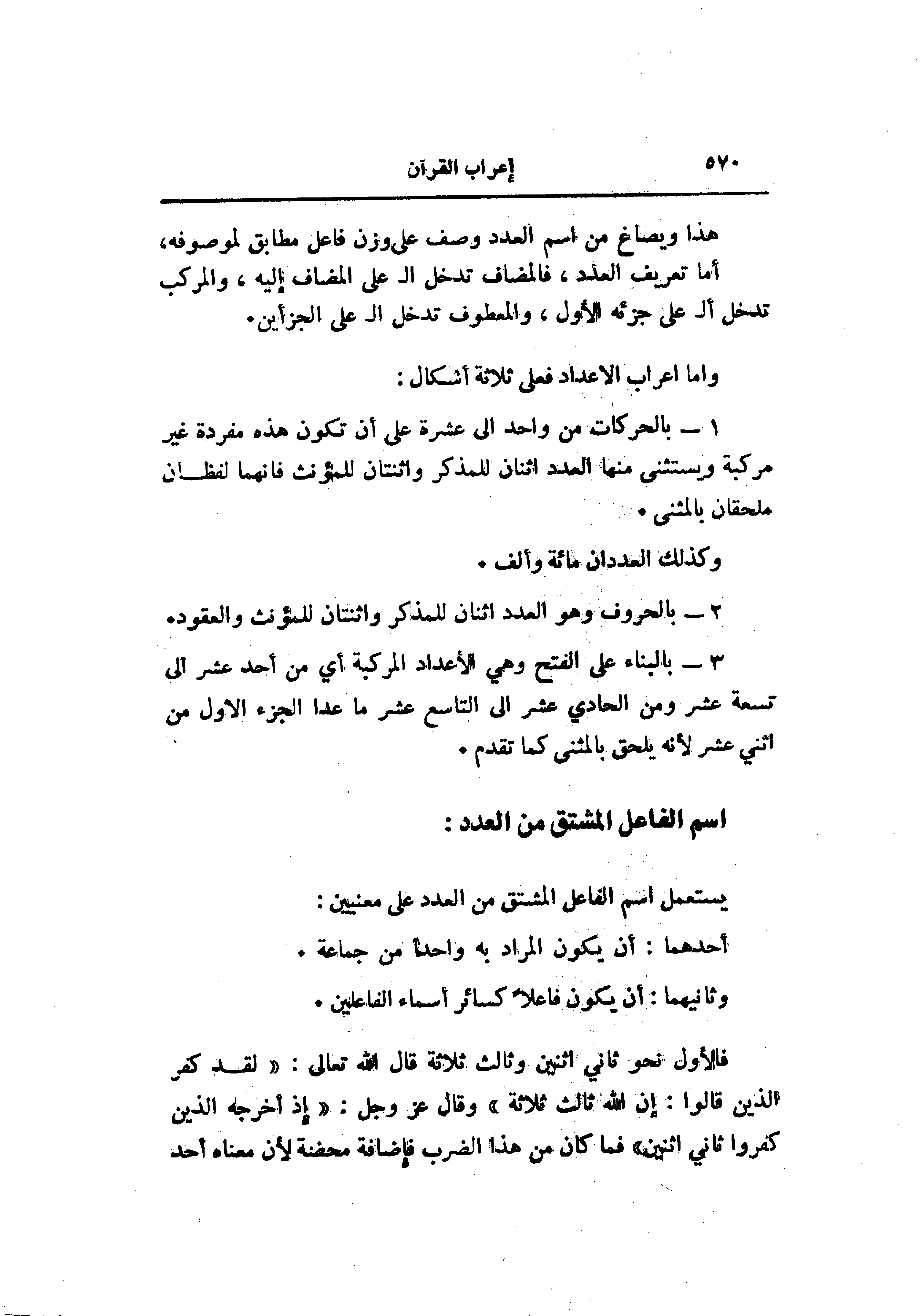 فالأول نحو ثاني اثنين وثالث ثلاثة قال الله تعالى: «لقد كفر الذين قالوا: إن الله ثالث ثلاثة» وقال عز وجل: «إذ أخرجه الذين كفروا ثاني اثنين» فما كان من هذا الضرب فإضافة محضة لأن معناه أحد
