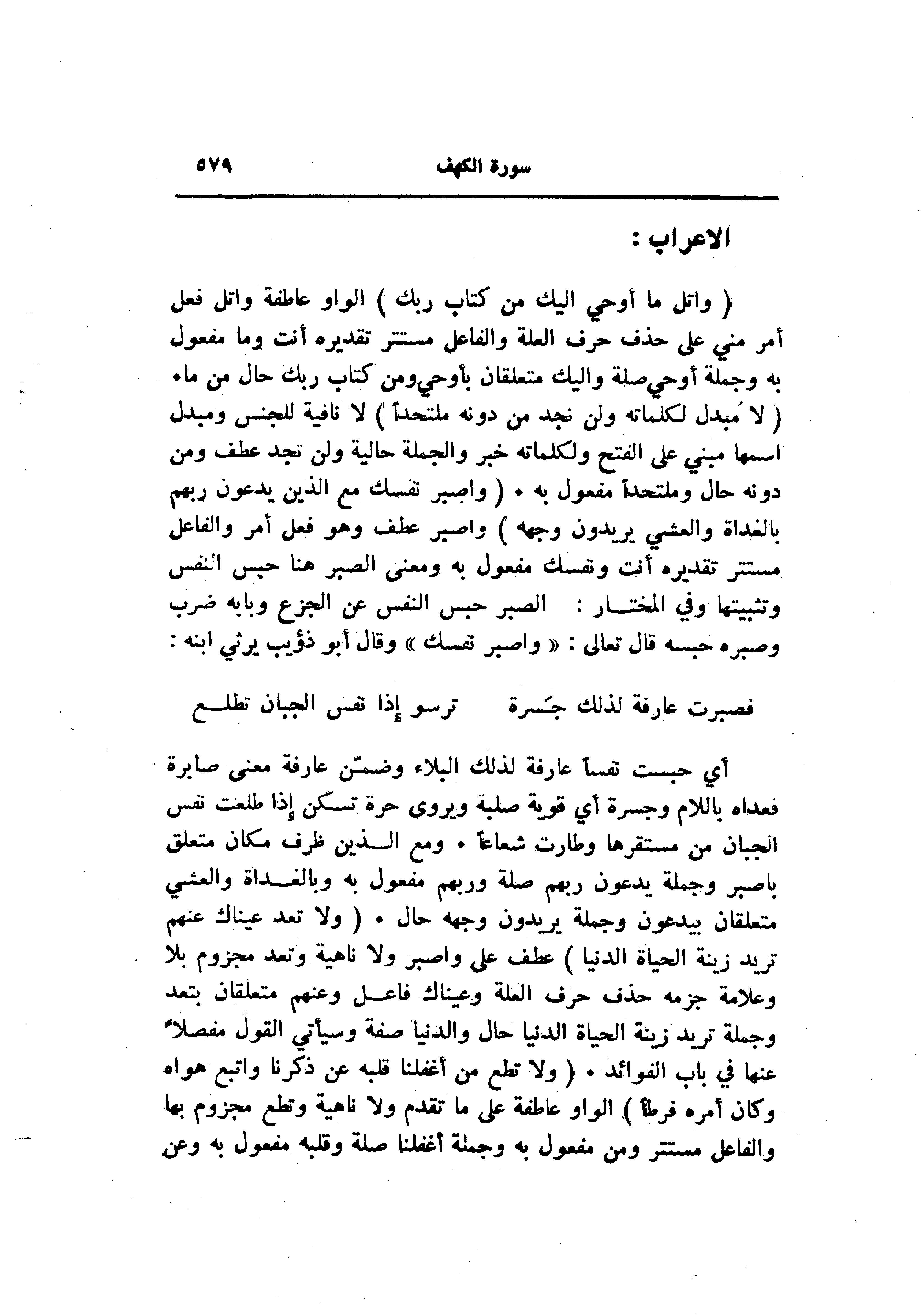 (لا مُبَدِّلَ لِكَلِماتِهِ وَلَنْ تَجِدَ مِنْ دُونِهِ مُلْتَحَداً) لا نافية للجنس ومبدل اسمها مبني على الفتح ولكلماته خبر والجملة حالية ولن تجد عطف ومن دونه حال وملتحدا مفعول به. (وَاصْبِرْ نَفْسَكَ مَعَ الَّذِينَ يَدْعُونَ رَبَّهُمْ بِالْغَداةِ وَالْعَشِيِّ يُرِيدُونَ وَجْهَهُ) واصبر عطف وهو فعل أمر والفاعل مستتر تقديره أنت ونفسك مفعول به ومعنى الصبر هنا حبس النفس وتثبيتها وفي المختار: الصبر حبس النفس عن الجزع وبابه ضرب وصبره حبسه قال تعالى: «واصبر نفسك» وقال أبو ذؤيب يرثي ابنه: