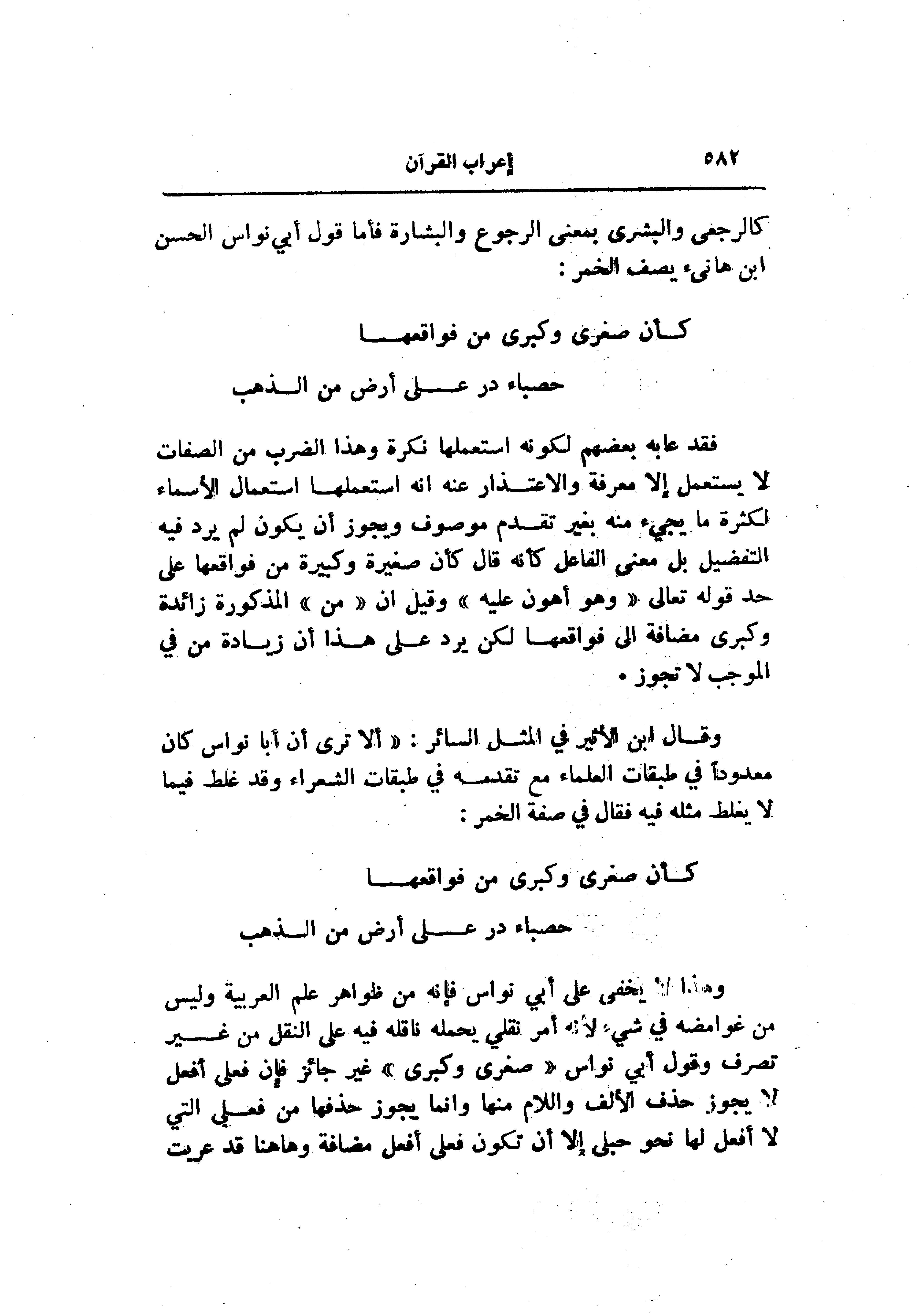 وهذا لا يخفى على أبي نواس فإنه من ظواهر علم العربية وليس من غوامضه في شيء لأنه أمر نقلي يحمله ناقله فيه على النقل من غير تصرف وقول أبي نواس «صغرى وكبرى» غير جائز فإن فعلى أفعل لا يجوز حذف الألف واللام منها وانما يجوز حذفها من فعلي التي لا أفعل لها نحو حبلى إلا أن تكون فعلى أفعل مضافة وهاهنا قد عريت