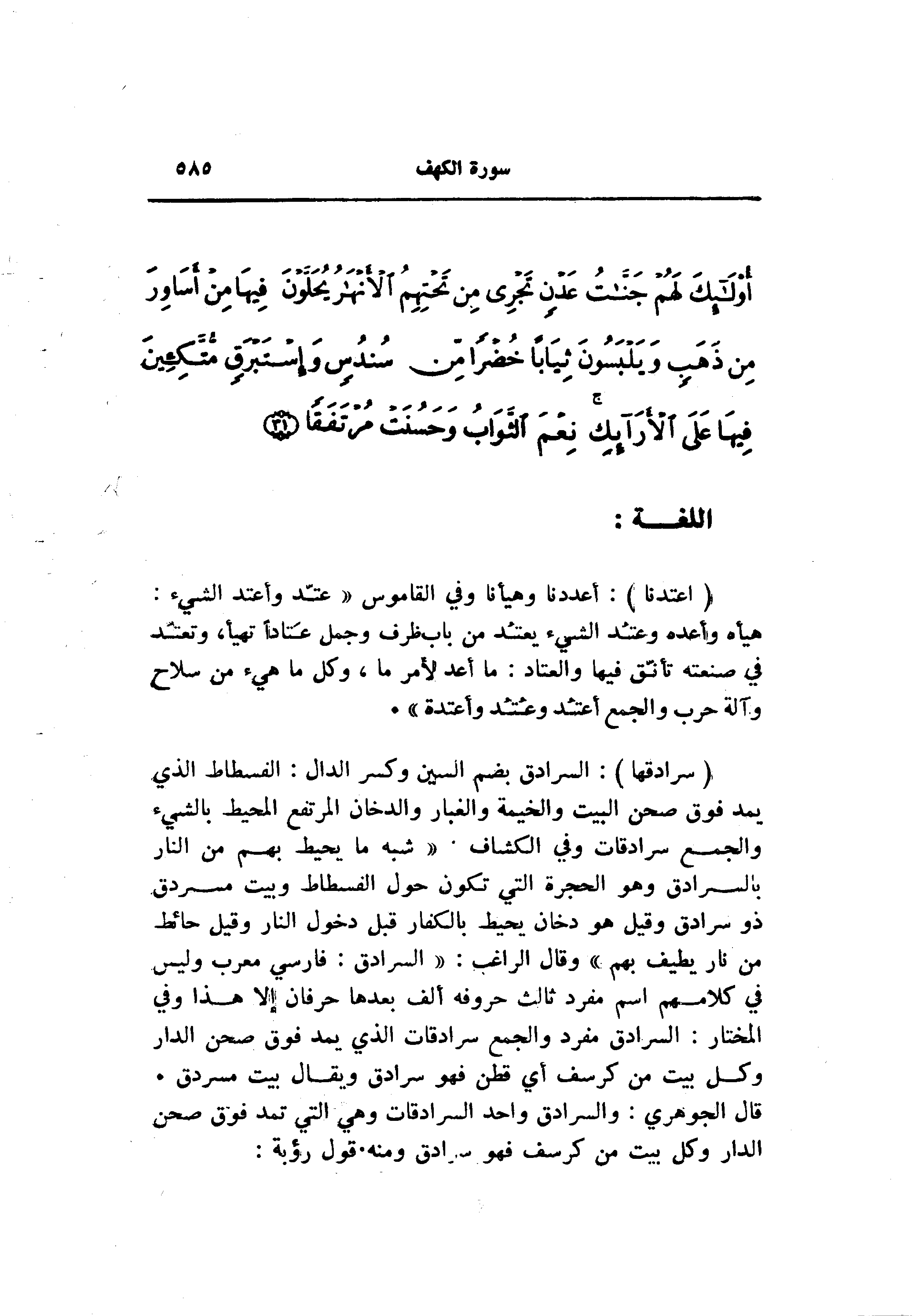 (سُرادِقُها) : السرادق بضم السين وكسر الدال: الفسطاط الذي يمد فوق صحن البيت والخيمة والغبار والدخان المرتفع المحيط بالشيء والجمع سرادقات وفي الكشاف: «شبه ما يحيط بهم من النار بالسرادق وهو الحجرة التي تكون حول الفسطاط وبيت مسردق ذو سرادق وقيل هو دخان يحيط بالكفار قبل دخول النار وقيل حائط من نار يطيف بهم» وقال الراغب: «السرادق: فارسي معرب وليس في كلامهم اسم مفرد ثالث حروفه ألف بعدها حرفان إلا هذا وفي المختار: السرادق مفرد والجمع سرادقات الذي يمد فوق صحن الدار وكل بيت من كرسف أي قطن فهو سرادق ويقال بيت مسردق.