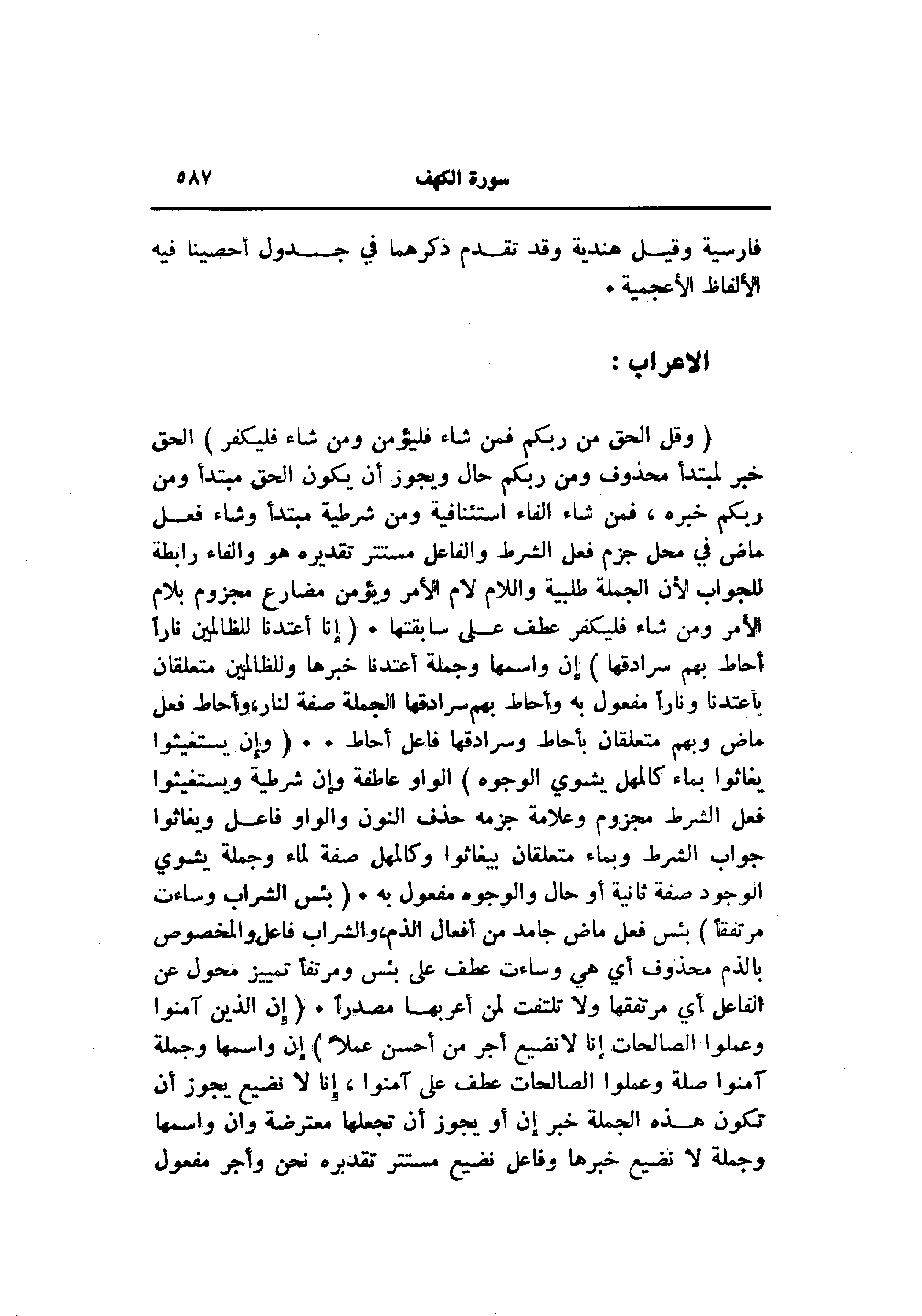 (وَقُلِ الْحَقُّ مِنْ رَبِّكُمْ فَمَنْ شاءَ فَلْيُؤْمِنْ وَمَنْ شاءَ فَلْيَكْفُرْ) الحق خبر لمبتدأ محذوف ومن ربكم حال ويجوز أن يكون الحق مبتدأ ومن ربكم خبره، فمن شاء الفاء استئنافية ومن شرطية مبتدأ وشاء فعل ماض في محل جزم فعل الشرط والفاعل مستتر تقديره هو والفاء رابطة للجواب لأن الجملة طلبية واللام لام الأمر ويؤمن مضارع مجزوم بلام الأمر ومن شاء فليكفر عطف على سابقتها. (إِنَّا أَعْتَدْنا لِلظَّالِمِينَ ناراً أَحاطَ بِهِمْ سُرادِقُها) إن واسمها وجملة أعتدنا خبرها وللظالمين متعلقان بأعتدنا ونارا مفعول به وأحاط بهم سرادقها الجملة صفة لنار، وأحاط فعل ماض وبهم متعلقان بأحاط وسرادقها فاعل أحاط.. (وَإِنْ يَسْتَغِيثُوا يُغاثُوا بِماءٍ كَالْمُهْلِ يَشْوِي الْوُجُوهَ) الواو عاطفة وإن شرطية ويستغيثوا فعل الشرط مجزوم وعلامة جزمه حذف النون والواو فاعل ويغاثوا جواب الشرط وبماء متعلقان بيغاثوا وكالمهل صفة لماء وجملة يشوي الوجود صفة ثانية أو حال والوجوه مفعول به. (بِئْسَ الشَّرابُ وَساءَتْ مُرْتَفَقاً) بئس فعل ماض جامد من أفعال الذم، والشراب فاعل والمخصوص بالذم محذوف أي هي وساءت عطف على بئس ومرتفا تمييز محول عن الفاعل أي مرتفقها ولا تلتفت لمن أعربها مصدرا. (إِنَّ الَّذِينَ آمَنُوا وَعَمِلُوا الصَّالِحاتِ إِنَّا لا نُضِيعُ أَجْرَ مَنْ أَحْسَنَ عَمَلًا) إن واسمها وجملة آمنوا صلة وعملوا الصالحات عطف على آمنوا، إنا لا نضيع يجوز أن تكون هذه الجملة خبر إن أو يجوز أن تجعلها معترضة وان واسمها وجملة لا نضيع خبرها وفاعل نضيع مستتر تقديره نحن وأجر مفعول