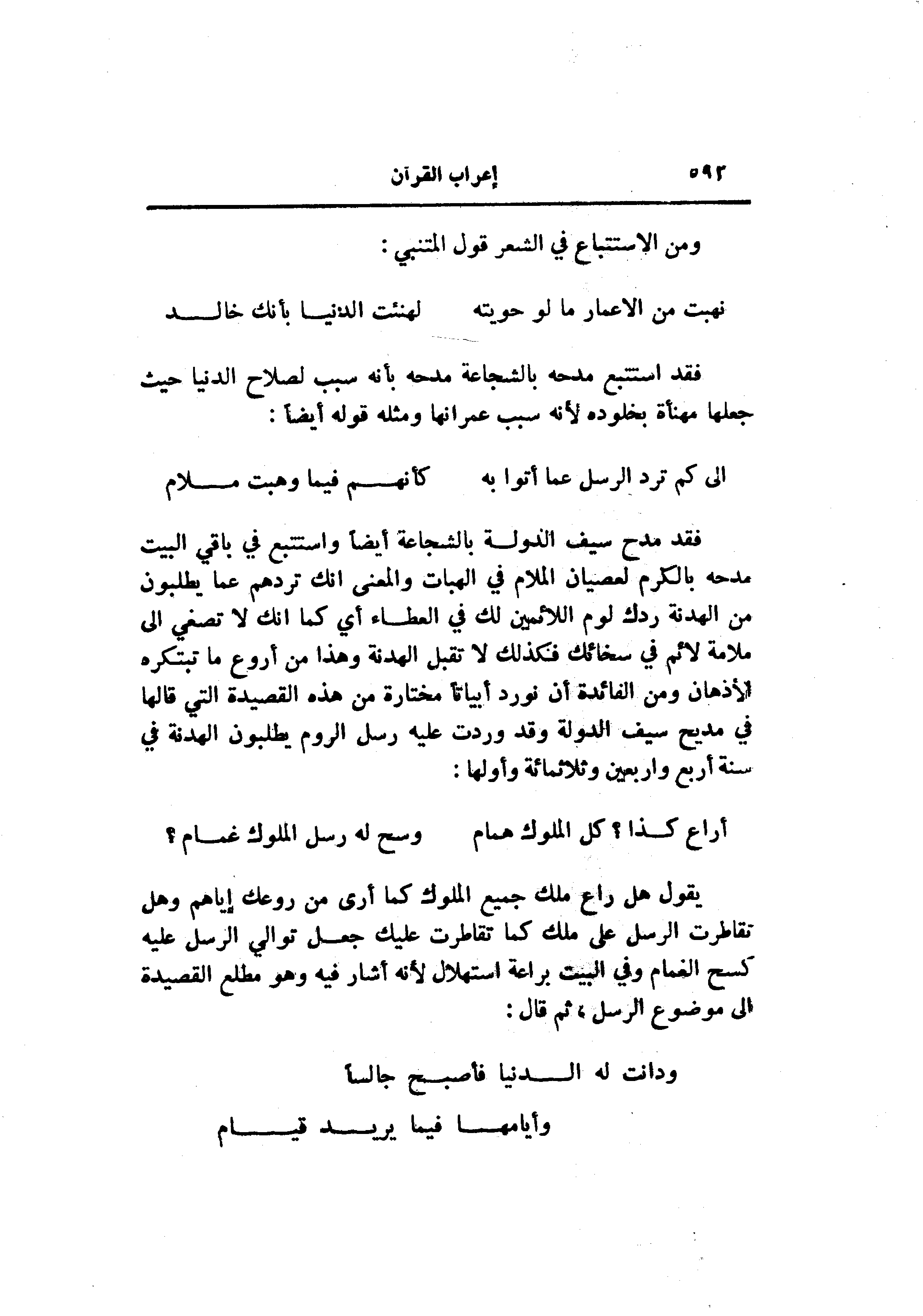 فقد استتبع مدحه بالشجاعة مدحه بأنه سبب لصلاح الدنيا حيث جعلها مهنأة بخلوده لأنه سبب عمرانها ومثله قوله أيضا: