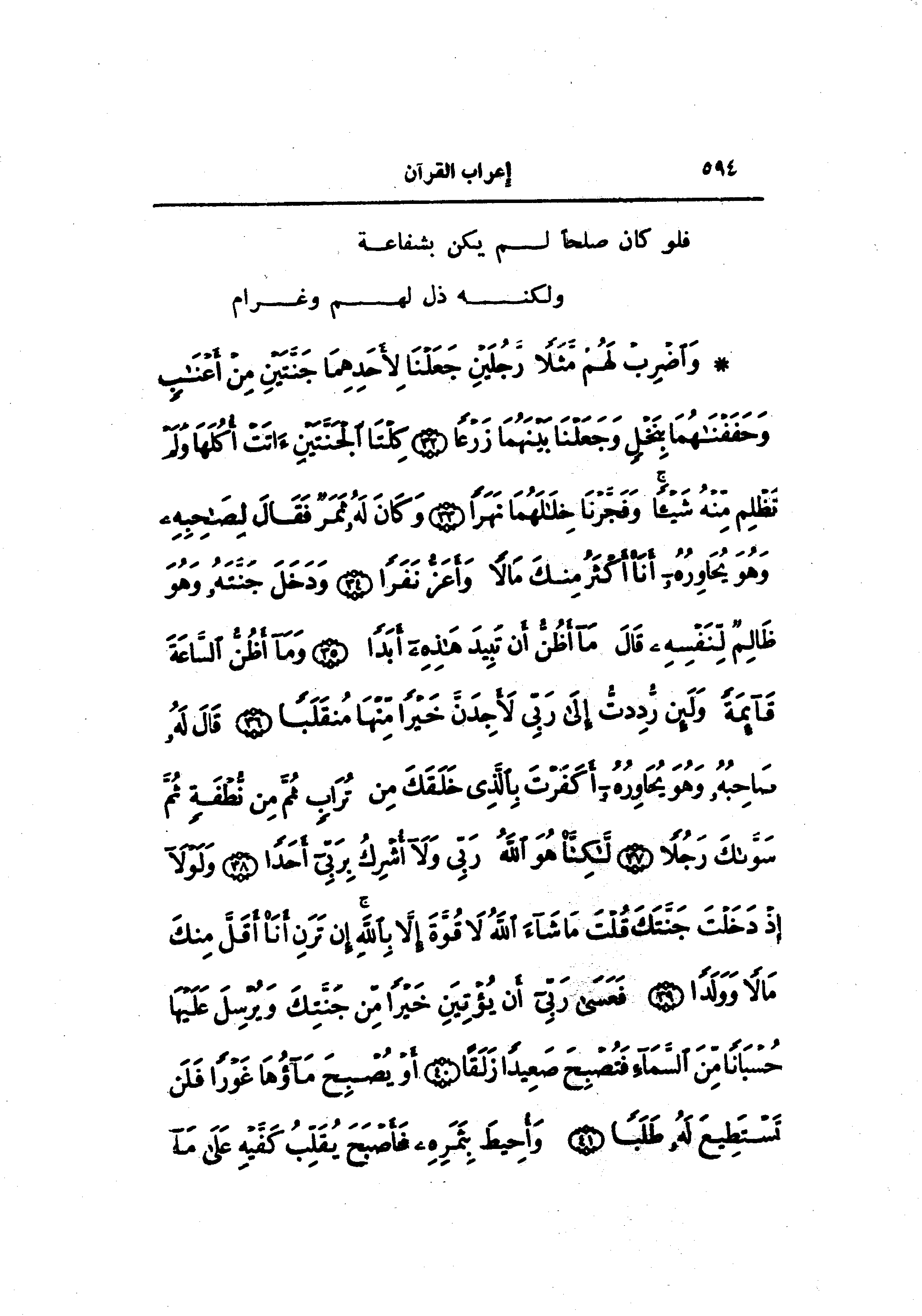 وَاضْرِبْ لَهُمْ مَثَلاً رَجُلَيْنِ جَعَلْنا لِأَحَدِهِما جَنَّتَيْنِ مِنْ أَعْنابٍ وَحَفَفْناهُما بِنَخْلٍ وَجَعَلْنا بَيْنَهُما زَرْعاً (32) كِلْتَا الْجَنَّتَيْنِ آتَتْ أُكُلَها وَلَمْ تَظْلِمْ مِنْهُ شَيْئاً وَفَجَّرْنا خِلالَهُما نَهَراً (33) وَكانَ لَهُ ثَمَرٌ فَقالَ لِصاحِبِهِ وَهُوَ يُحاوِرُهُ أَنَا أَكْثَرُ مِنْكَ مالاً وَأَعَزُّ نَفَراً (34) وَدَخَلَ جَنَّتَهُ وَهُوَ ظالِمٌ لِنَفْسِهِ قالَ ما أَظُنُّ أَنْ تَبِيدَ هذِهِ أَبَداً (35) وَما أَظُنُّ السَّاعَةَ قائِمَةً وَلَئِنْ رُدِدْتُ إِلى رَبِّي لَأَجِدَنَّ خَيْراً مِنْها مُنْقَلَباً (36)