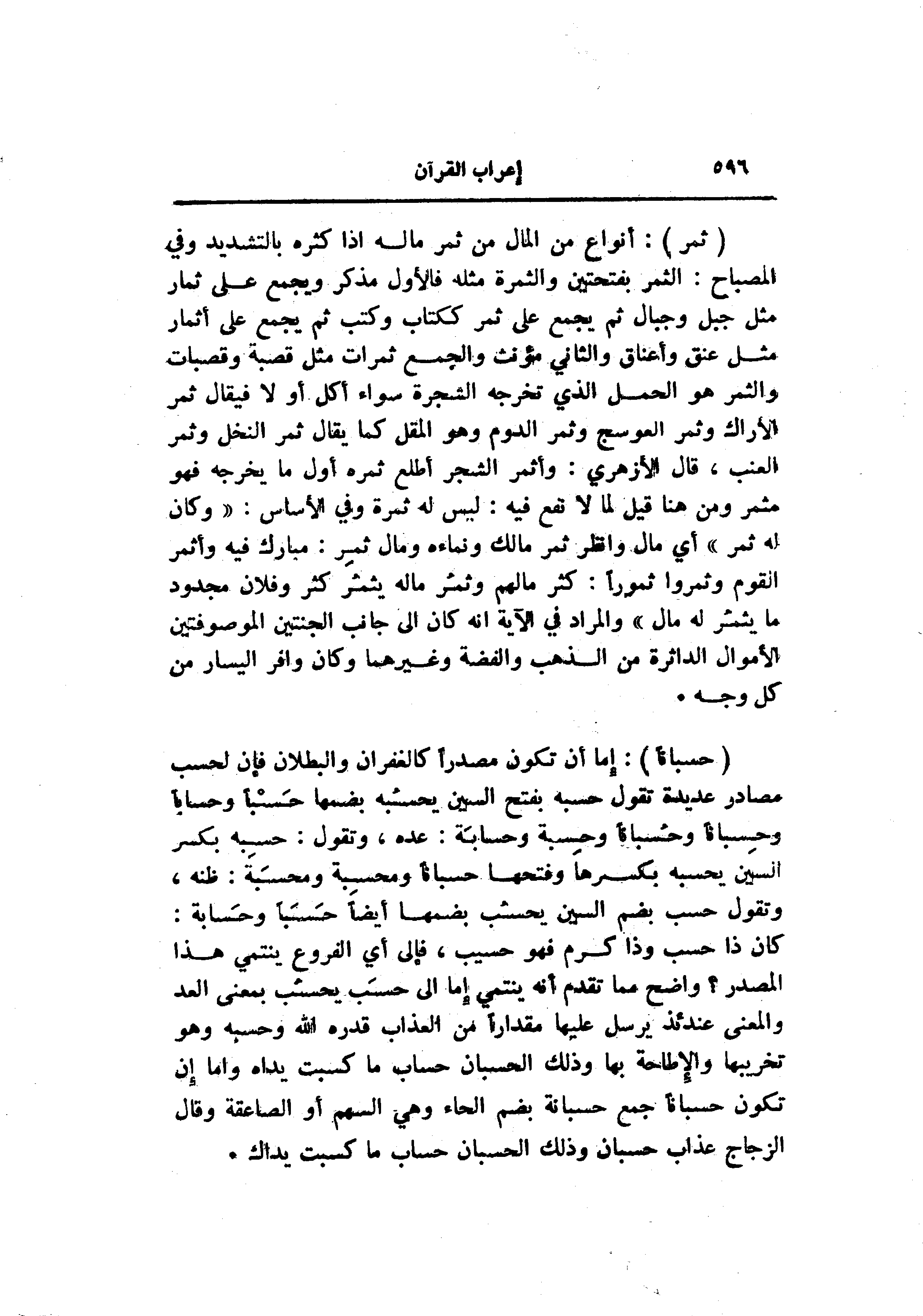 (ثَمَرٌ) : أنواع من المال من ثمر ماله إذا كثره بالتشديد وفي المصباح: الثمر بفتحتين والثمرة مثله فالأول مذكر ويجمع على ثمار مثل جبل وجبال ثم يجمع على ثمر ككتاب وكتب ثم يجمع على أثمار مثل عنق وأعناق والثاني مؤنث والجمع ثمرات مثل قصبة وقصبات والثمر هو الحمل الذي تخرجه الشجرة سواء أكل أو لا فيقال ثمر الأراك وثمر العوسج وثمر الدوم وهو المقل كما يقال ثمر النخل وثمر العنب، قال الأزهري: وأثمر الشجر أطلع ثمره أول ما يخرجه فهو مثمر ومن هنا قيل لما لا نفع فيه: ليس له ثمرة وفي الأساس: «وكان له ثمر» أي مال وانظر ثمر مالك ونماءه ومال ثمر: مبارك فيه وأثمر القوم وثمروا ثمورا: كثر مالهم وثمر ماله يثمر كثر وفلان مجدود ما يثمر له مال» والمراد في الآية انه كان الى جانب الجنتين الموصوفتين الأموال الداثرة من الذهب والفضة وغيرهما وكان وافر اليسار من كل وجه.
