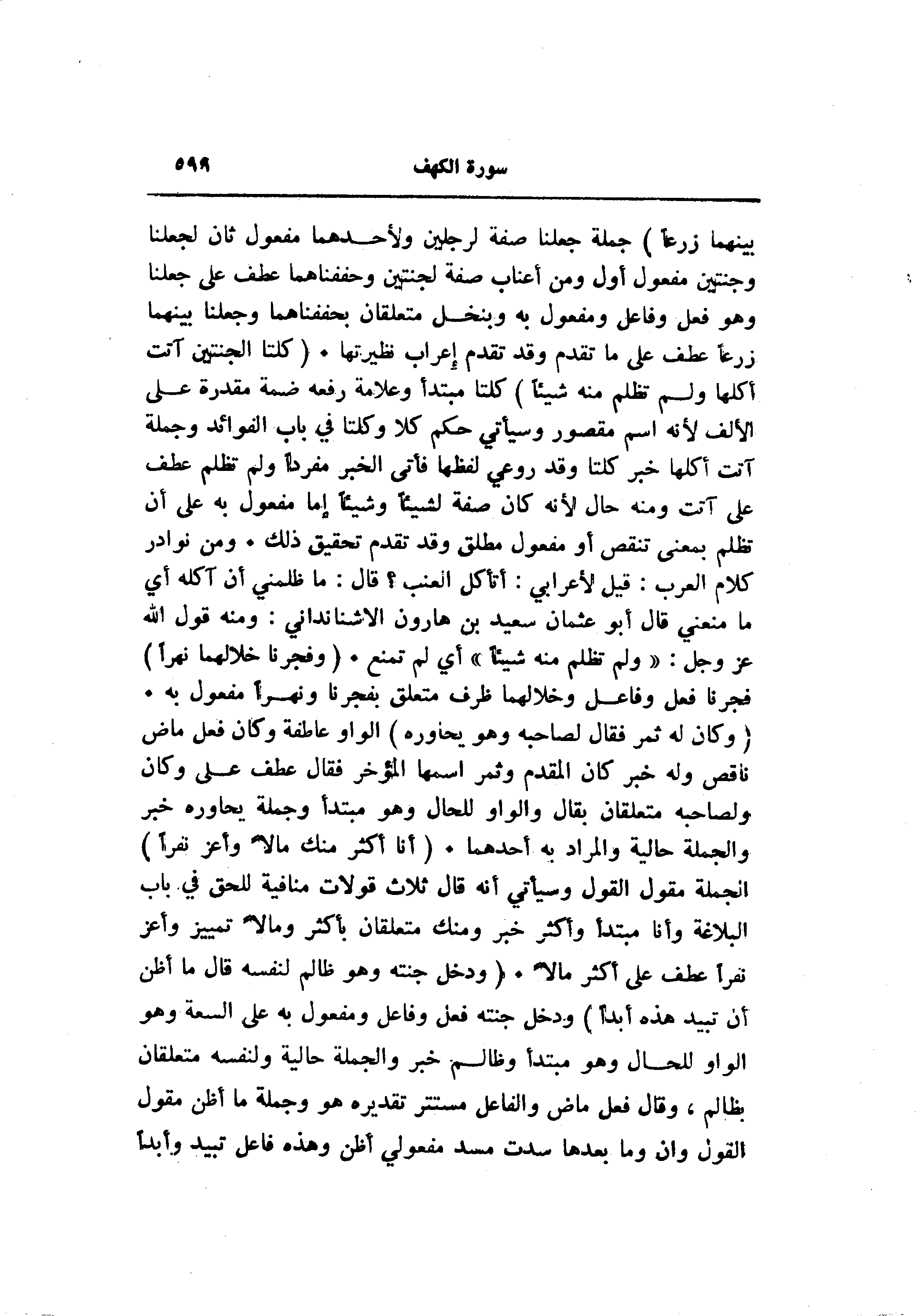 جملة جعلنا صفة لرجلين ولأحدهما مفعول ثان لجعلنا وجنتين مفعول أول ومن أعناب صفة لجنتين وحففناهما عطف على جعلنا وهو فعل وفاعل ومفعول به وبنخل متعلقان بحففناهما وجعلنا بينهما زرعا عطف على ما تقدم وقد تقدم إعراب نظيرتها. (كِلْتَا الْجَنَّتَيْنِ آتَتْ أُكُلَها وَلَمْ تَظْلِمْ مِنْهُ شَيْئاً) كلتا مبتدأ وعلامة رفعه ضمة مقدرة على الألف لأنه اسم مقصور وسيأتي حكم كلا وكلتا في باب الفوائد وجملة آتت أكلها خبر كلتا وقد روعي لفظها فأتى الخبر مفردا ولم تظلم عطف على آتت ومنه حال لأنه كان صفة لشيئا وشيئا إما مفعول به على أن تظلم بمعنى تنقص أو مفعول مطلق وقد تقدم تحقيق ذلك. ومن نوادر كلام العرب: قيل لأعرابي: أتأكل العنب؟ قال: ما ظلمني أن آكله أي ما منعني قال أبو عثمان سعيد بن هارون الاشنانداني: ومنه قول الله عز وجل: «ولم تظلم منه شيئا» أي لم تمنع. (وَفَجَّرْنا خِلالَهُما نَهَراً) فجرنا فعل وفاعل وخلالهما ظرف متعلق بفجرنا ونهرا مفعول به.