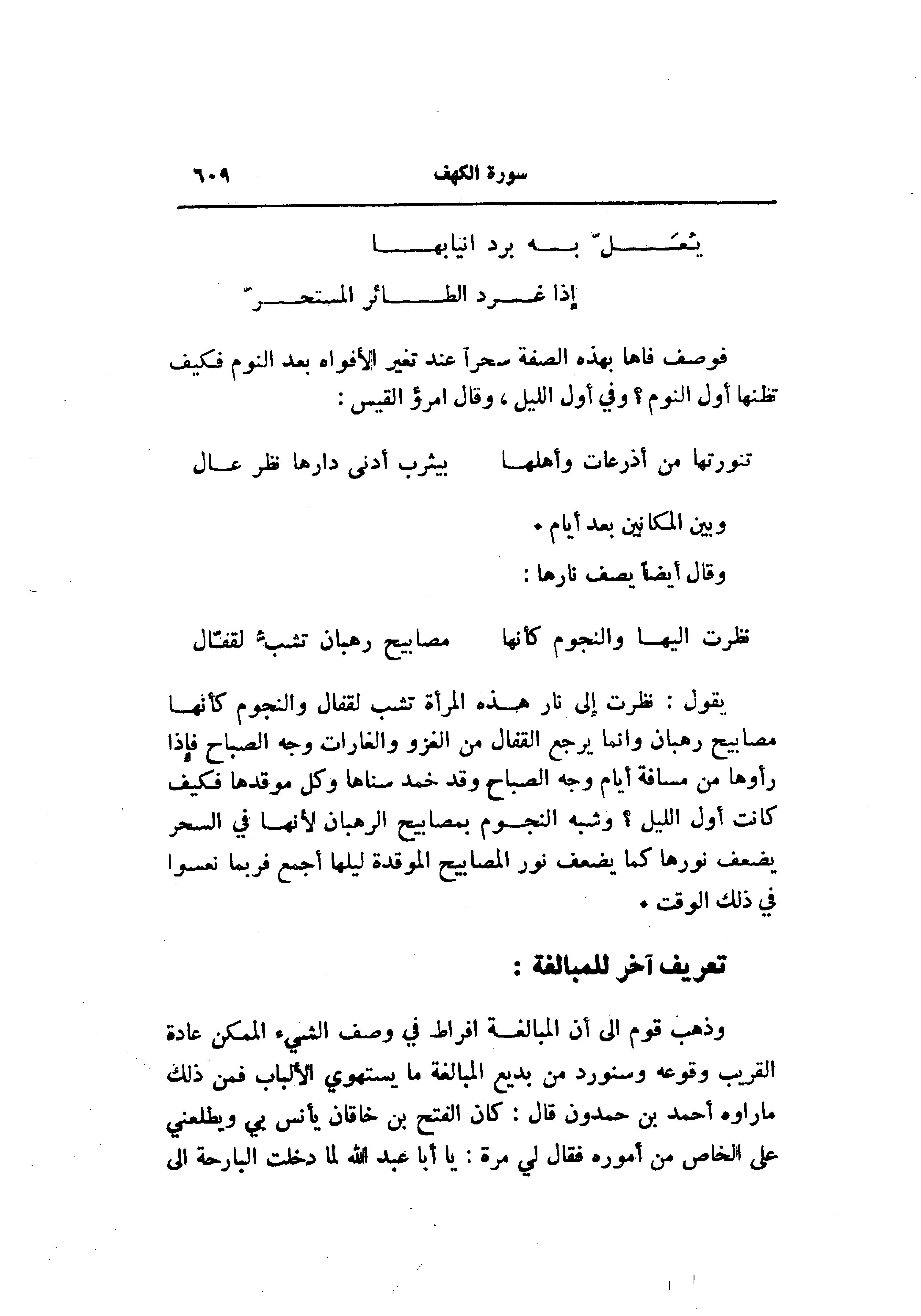 وذهب قوم الى أن المبالغة افراط في وصف الشيء الممكن عادة القريب وقوعه وسنورد من بديع المبالغة ما يستهوي الألباب فمن ذلك ما رواه أحمد بن حمدون قال: كان الفتح بن خاقان يأنس بي ويطلعني على الخاص من أموره فقال لي مرة: يا أبا عبد الله لما دخلت البارحة الى