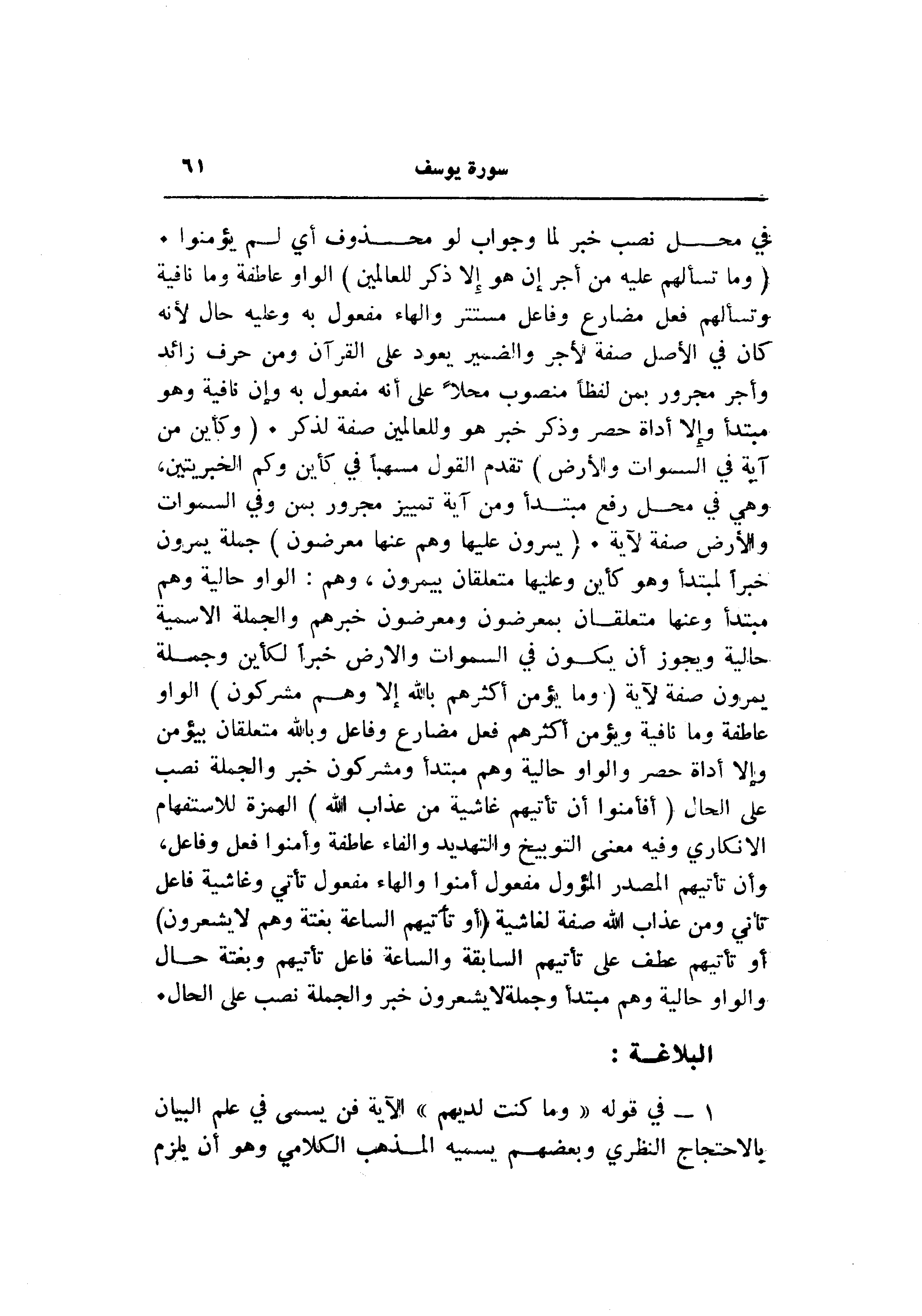 (وَما تَسْئَلُهُمْ عَلَيْهِ مِنْ أَجْرٍ إِنْ هُوَ إِلَّا ذِكْرٌ لِلْعالَمِينَ) الواو عاطفة وما نافية وتسألهم فعل مضارع وفاعل مستتر والهاء مفعول به وعليه حال لأنه كان في الأصل صفة لأجر والضمير يعود على القرآن ومن حرف زائد وأجر مجرور بمن لفظا منصوب محلا على أنه مفعول به وإن نافية وهو مبتدأ وإلا أداة حصر وذكر خبر هو وللعالمين صفة لذكر. (وَكَأَيِّنْ مِنْ آيَةٍ فِي السَّماواتِ وَالْأَرْضِ) تقدم القول مسهبا في كأين وكم الخبريتين، وهي في محل رفع مبتدأ ومن آية تمييز مجرور بمن وفي السموات والأرض صفة لآية. (يَمُرُّونَ عَلَيْها وَهُمْ عَنْها مُعْرِضُونَ) جملة يمرون خبرا لمبتدأ وهو كأين وعليها متعلقان بيمرون، وهم: الواو حالية وهم مبتدأ وعنها متعلقان بمعرضون ومعرضون خبرهم والجملة الاسمية حالية ويجوز أن يكون في السموات والأرض خبرا لكأين وجملة يمرون صفة لآية (وَما يُؤْمِنُ أَكْثَرُهُمْ بِاللَّهِ إِلَّا وَهُمْ مُشْرِكُونَ) الواو عاطفة وما نافية ويؤمن أكثرهم فعل مضارع وفاعل وبالله متعلقان بيؤمن وإلا أداة حصر والواو حالية وهم مبتدأ ومشركون خبر والجملة نصب على الحال (أَفَأَمِنُوا أَنْ تَأْتِيَهُمْ غاشِيَةٌ مِنْ عَذابِ اللَّهِ) الهمزة للاستفهام الانكاري وفيه معنى التوبيخ والتهديد والفاء عاطفة وأمنوا فعل وفاعل، وأن تأتيهم المصدر المؤول مفعول أمنوا والهاء مفعول تأتي وغاشية فاعل تأتي ومن عذاب الله صفة لغاشية (أَوْ تَأْتِيَهُمُ السَّاعَةُ بَغْتَةً وَهُمْ لا يَشْعُرُونَ) أو تأتيهم عطف على تأتيهم السابقة والساعة فاعل تأتيهم وبغتة حال والواو حالية وهم مبتدأ وجملة لا يشعرون خبر والجملة نصب على الحال.