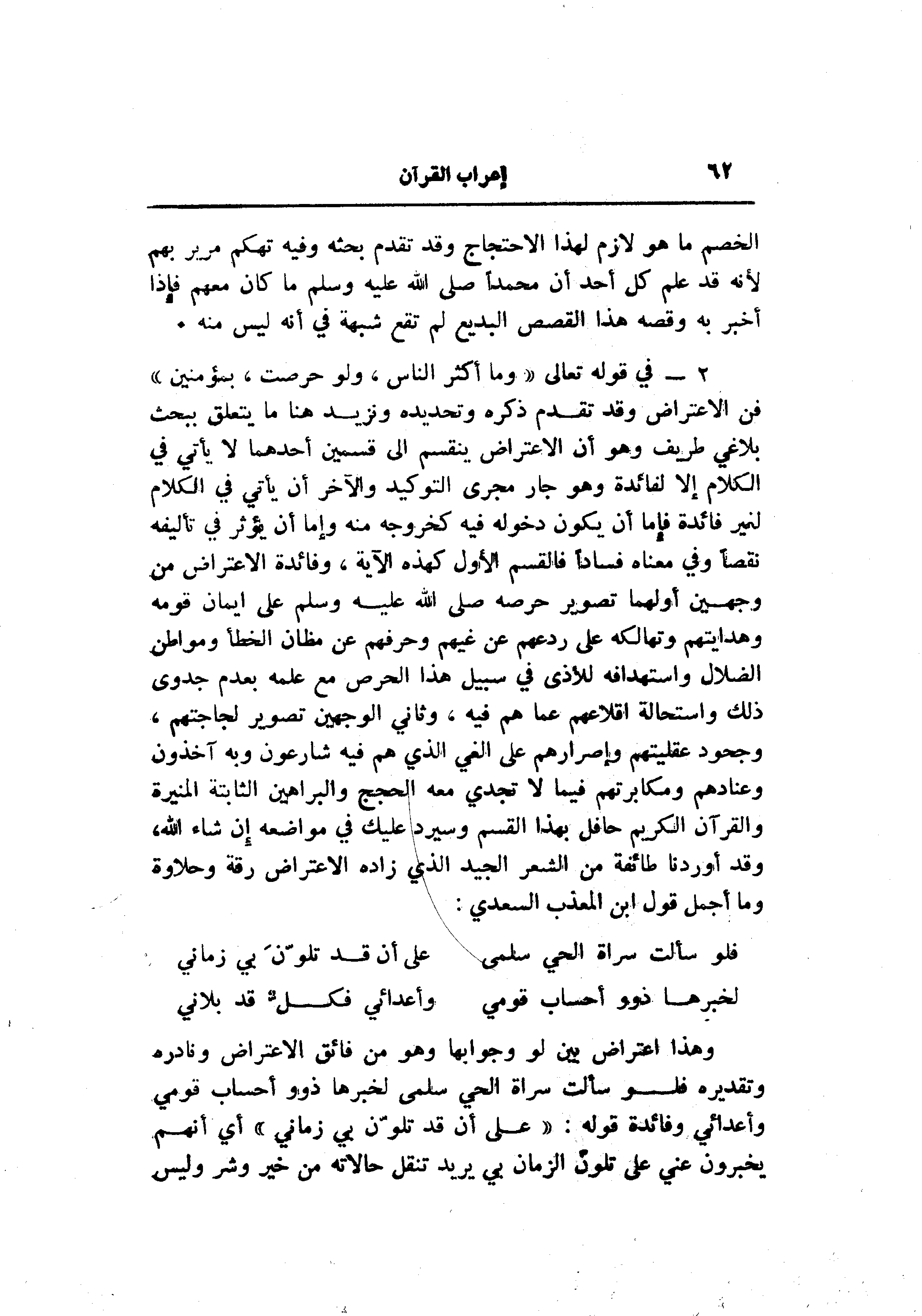 2- في قوله تعالى «وما أكثر الناس، ولو حرصت، بمؤمنين» فن الاعتراض وقد تقدم ذكره وتحديده ونزيد هنا ما يتعلق ببحث بلاغي طريف وهو أن الاعتراض ينقسم الى قسمين أحدهما لا يأتي في الكلام إلا لفائدة وهو جار مجرى التوكيد والآخر أن يأتي في الكلام لغير فائدة فإما أن يكون دخوله فيه كخروجه منه وإما أن يؤثر في تأليفه نقصا وفي معناه فسادا فالقسم الأول كهذه الآية، وفائدة الاعتراض من وجهين أولهما تصوير حرصه صلى الله عليه وسلم على ايمان قومه وهدايتهم وتهالكه على ردعهم عن غيهم وحرفهم عن مظان الخطأ ومواطن الضلال واستهدافه للأذى في سبيل هذا الحرص مع علمه بعدم جدوى ذلك واستحالة إقلاعهم عما هم فيه، وثاني الوجهين تصوير لجاجتهم، وجحود عقليتهم وإصرارهم على الغي الذي هم فيه شارعون وبه آخذون وعنادهم ومكابرتهم فيما لا تجدي معه الحجج والبراهين الثابتة المنيرة والقرآن الكريم حافل بهذا القسم وسيرد عليك في مواضعه إن شاء الله، وقد أوردنا طائفة من الشعر الجيد الذي زاده الاعتراض رقة وحلاوة وما أجمل قول ابن المعذب السعدي: