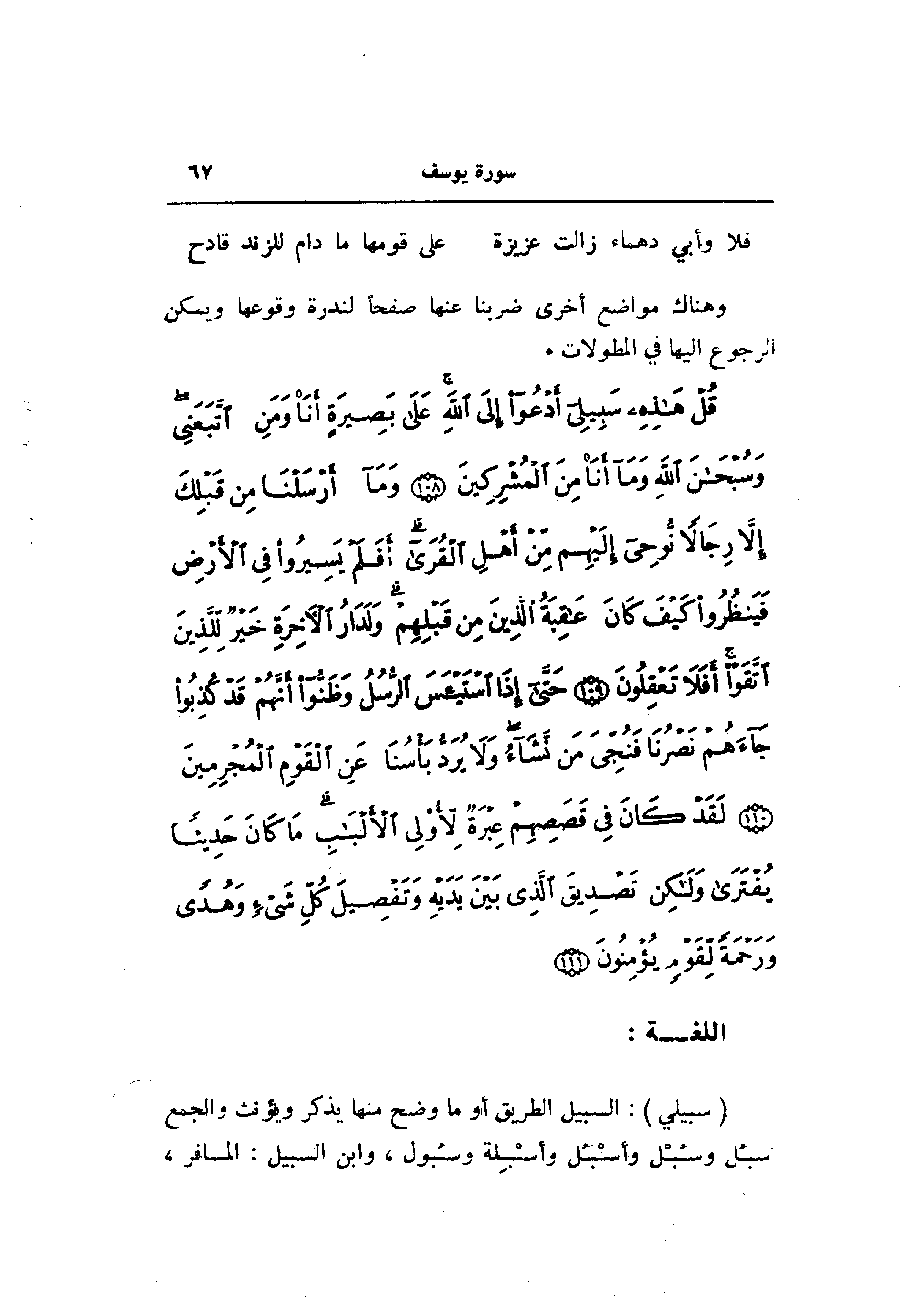 قُلْ هذِهِ سَبِيلِي أَدْعُوا إِلَى اللَّهِ عَلى بَصِيرَةٍ أَنَا وَمَنِ اتَّبَعَنِي وَسُبْحانَ اللَّهِ وَما أَنَا مِنَ الْمُشْرِكِينَ (108) وَما أَرْسَلْنا مِنْ قَبْلِكَ إِلاَّ رِجالاً نُوحِي إِلَيْهِمْ مِنْ أَهْلِ الْقُرى أَفَلَمْ يَسِيرُوا فِي الْأَرْضِ فَيَنْظُرُوا كَيْفَ كانَ عاقِبَةُ الَّذِينَ مِنْ قَبْلِهِمْ وَلَدارُ الْآخِرَةِ خَيْرٌ لِلَّذِينَ اتَّقَوْا أَفَلا تَعْقِلُونَ (109) حَتَّى إِذَا اسْتَيْأَسَ الرُّسُلُ وَظَنُّوا أَنَّهُمْ قَدْ كُذِبُوا جاءَهُمْ نَصْرُنا فَنُجِّيَ مَنْ نَشاءُ وَلا يُرَدُّ بَأْسُنا عَنِ الْقَوْمِ الْمُجْرِمِينَ (110) لَقَدْ كانَ فِي قَصَصِهِمْ عِبْرَةٌ لِأُولِي الْأَلْبابِ ما كانَ حَدِيثاً يُفْتَرى وَلكِنْ تَصْدِيقَ الَّذِي بَيْنَ يَدَيْهِ وَتَفْصِيلَ كُلِّ شَيْءٍ وَهُدىً وَرَحْمَةً لِقَوْمٍ يُؤْمِنُونَ (111)