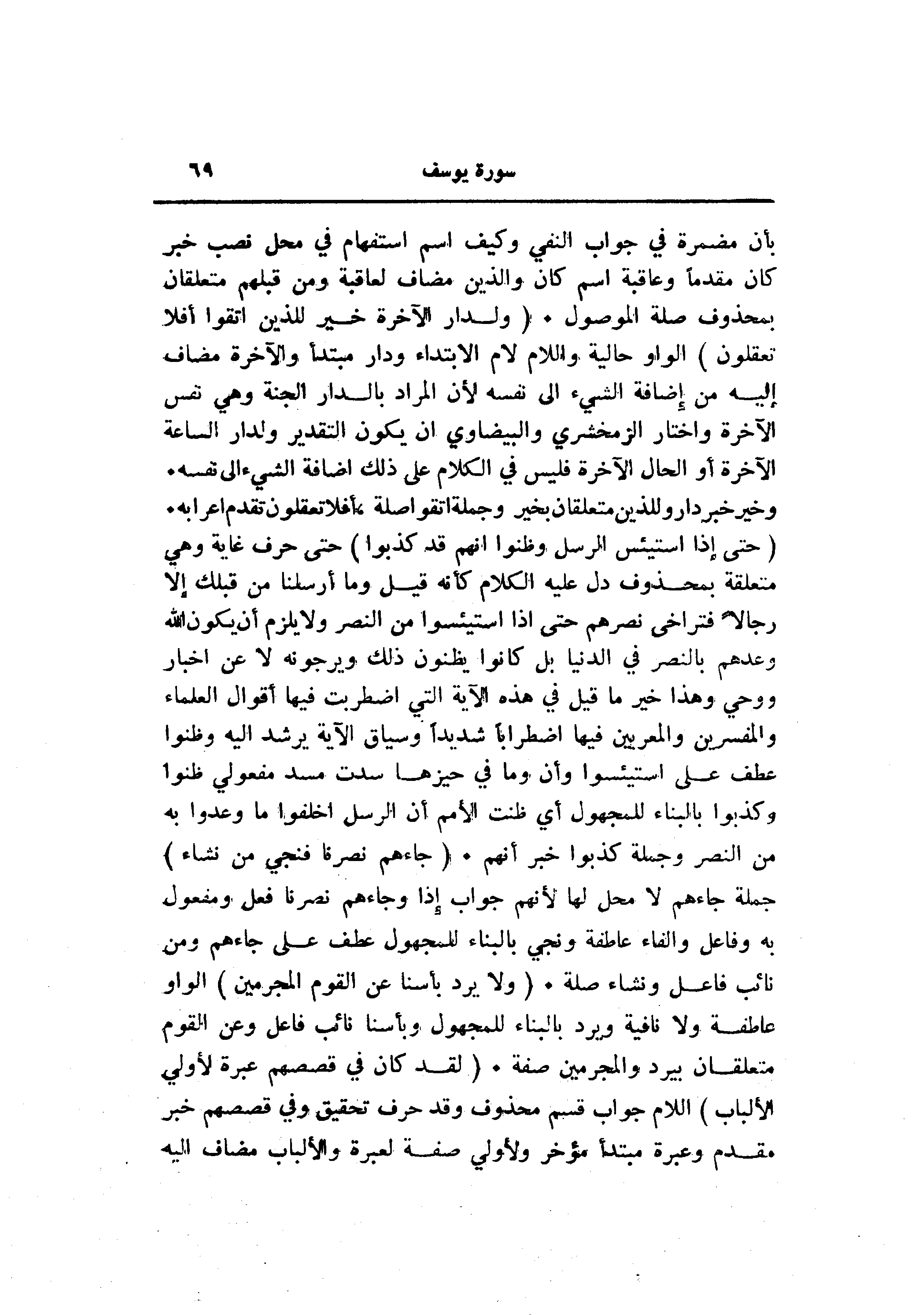 (حَتَّى إِذَا اسْتَيْأَسَ الرُّسُلُ وَظَنُّوا أَنَّهُمْ قَدْ كُذِبُوا) حتى حرف غاية وهي متعلقة بمحذوف دل عليه الكلام كأنه قيل وما أرسلنا من قبلك إلا رجالا فتراخى نصرهم حتى إذا استيئسوا من النصر ولا يلزم أن يكون الله وعدهم بالنصر في الدنيا بل كانوا يظنون ذلك ويرجونه لا عن اخبار ووحي وهذا خير ما قيل في هذه الآية التي اضطربت فيها أقوال العلماء والمفسرين والمعربين فيها اضطرابا شديدا وسياق الآية يرشد اليه وظنوا عطف على استيئسوا وأن وما في حيزها سدت مسد مفعولي ظنوا وكذبوا بالبناء للمجهول أي ظنت الأمم أن الرسل أخلفوا ما وعدوا به من النصر وجملة كذبوا خبر أنهم. (جاءَهُمْ نَصْرُنا فَنُجِّيَ مَنْ نَشاءُ) جملة جاءهم لا محل لها لأنهم جواب إذا وجاءهم نصرنا فعل ومفعول به وفاعل والفاء عاطفة ونجي بالبناء للمجهول عطف على جاءهم ومن نائب فاعل ونشاء صلة. (وَلا يُرَدُّ بَأْسُنا عَنِ الْقَوْمِ الْمُجْرِمِينَ) الواو عاطفة ولا نافية ويرد بالبناء للمجهول وبأسنا نائب فاعل وعن القوم متعلقان بيرد والمجرمين صفة. (لَقَدْ كانَ فِي قَصَصِهِمْ عِبْرَةٌ لِأُولِي الْأَلْبابِ) اللام جواب قسم محذوف وقد حرف تحقيق وفي قصصهم خبر مقدم وعبرة مبتدأ مؤخر ولأولي صفة لعبرة والألباب مضاف اليه