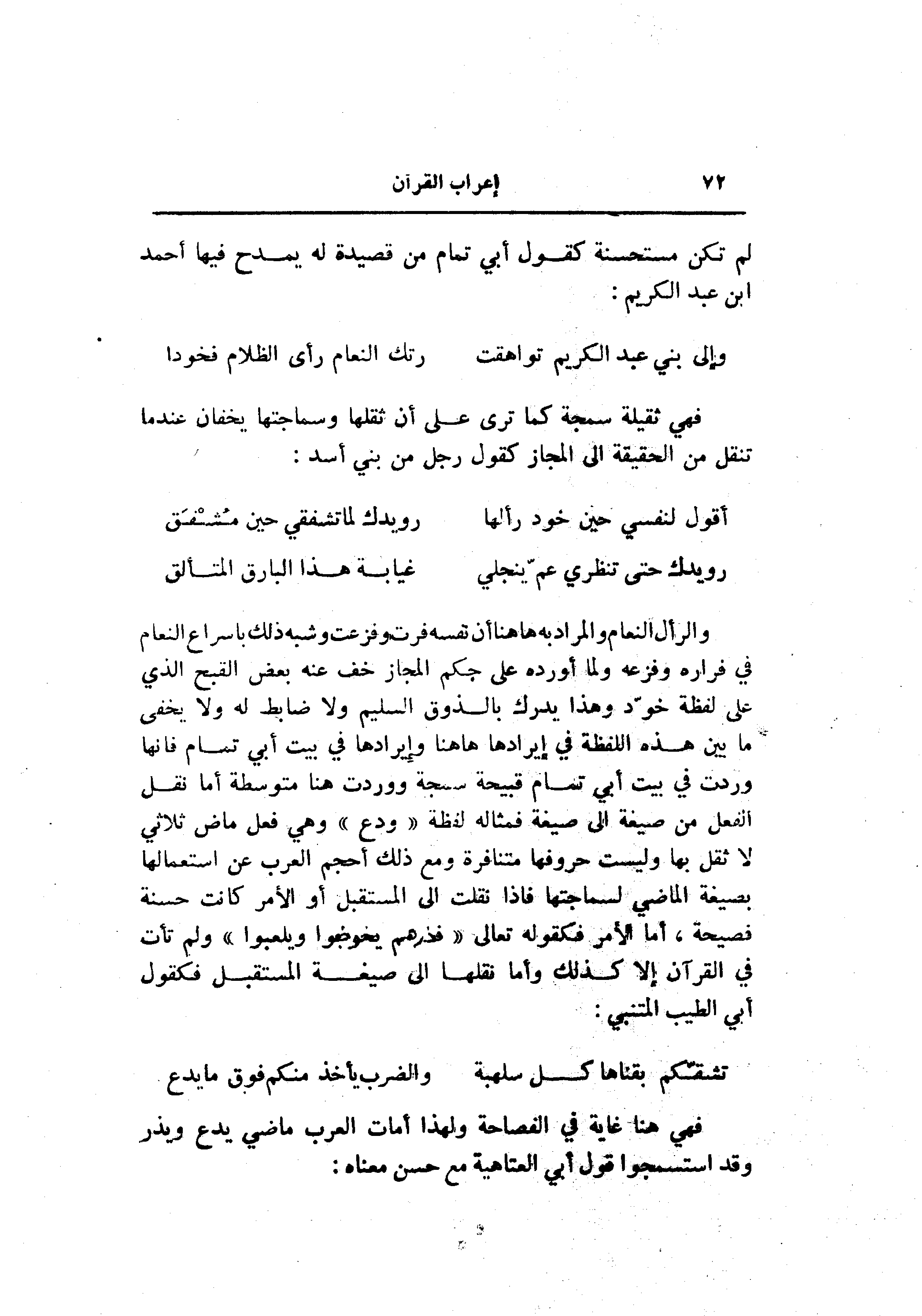 والرأل النعام والمراد به هاهنا أن نفسه فرت وفزعت وشبه ذلك باسراع النعام في فراره وفزعه ولما أورده على حكم المجاز خف عنه بعض القبح الذي على لفظة خوّد وهذا يدرك بالذوق السليم ولا ضابط له ولا يخفى ما بين هذه اللفظة في إيرادها هاهنا وإيرادها في بيت أبي تمام فانها وردت في بيت أبي تمام قبيحة سجة ووردت هنا متوسطة أما نقل الفعل من صيغة الى صيغة فمثاله لفظة «ودع» وهي فعل ماض ثلاثي لا ثقل بها وليست حروفها متنافرة ومع ذلك أحجم العرب عن استعمالها بصيغة الماضي لسماجتها فاذا نقلت الى المستقبل أو الأمر كانت حسنة فصيحة، أما الأمر فكقوله تعالى «فذرهم يخوضوا ويلعبوا» ولم تأت في القرآن إلا كذلك وأما نقلها الى صيغة المستقبل فكقول أبي الطيب المتنبي: