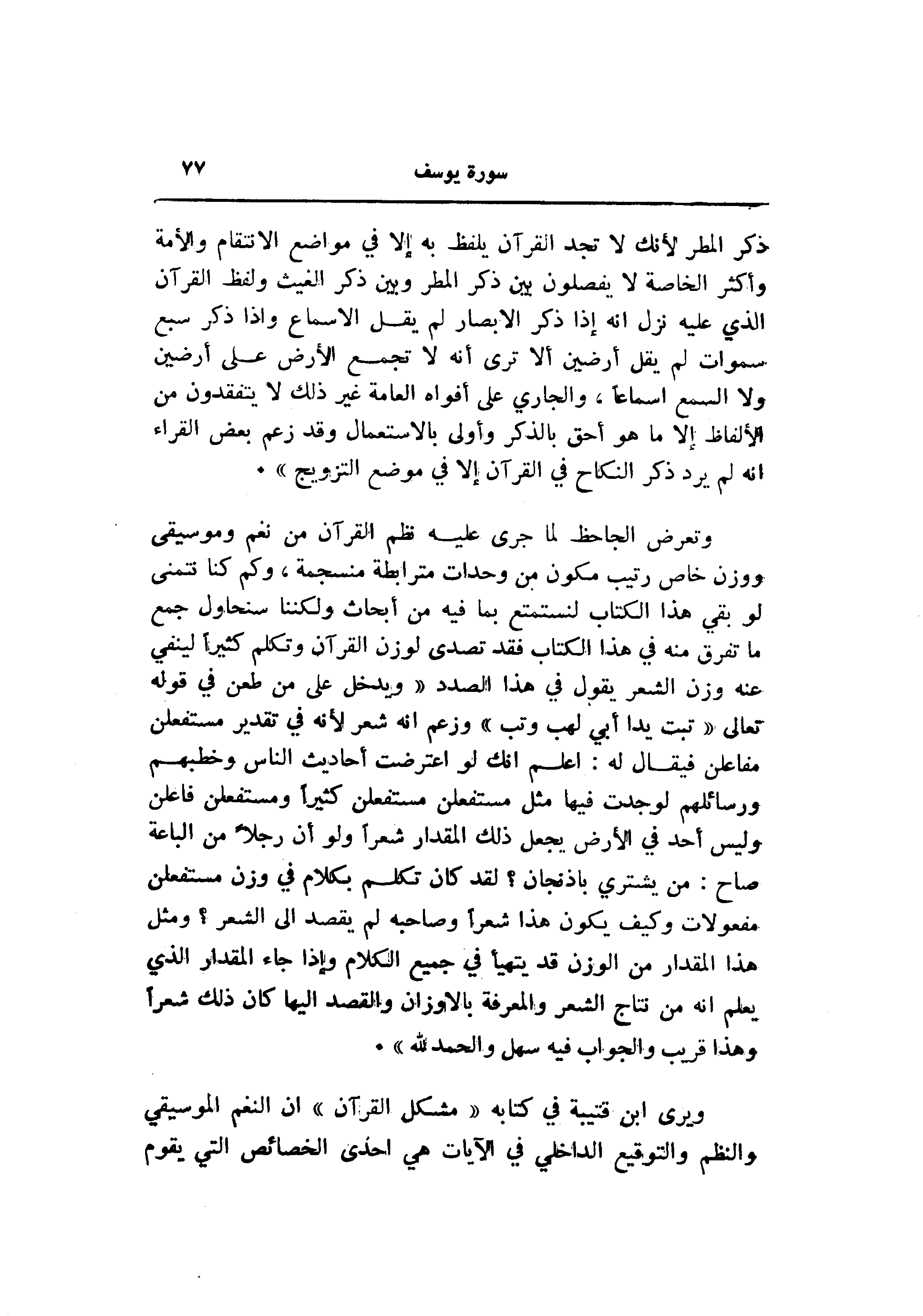 وتعرض الجاحظ لما جرى عليه نظم القرآن من نغم وموسيقى ووزن خاص رتيب مكون من وحدات مترابطة منسجمة، وكم كنا نتمنى لو بقي هذا الكتاب لنستمتع بما فيه من أبحاث ولكننا سنحاول جمع ما تفرق منه في هذا الكتاب فقد تصدى لوزن القرآن وتكلم كثيرا لينفي عنه وزن الشعر يقول في هذا الصدد «ويدخل على من طعن في قوله تعالى «تبت يدا أبي لهب وتب» وزعم انه شعر لأنه في تقدير مستفعلن مفاعلن فيقال له: اعلم انك لو اعترضت أحاديث الناس وخطبهم ورسائلهم لوجدت فيها مثل مستفعلن مستفعلن كثيرا ومستفعلن فاعلن وليس أحد في الأرض يجعل ذلك المقدار شعرا ولو أن رجلا من الباعة صاح: من يشتري باذنجان؟ لقد كان تكلم بكلام في وزن مستفعلن مفعولات وكيف يكون هذا شعرا وصاحبه لم يقصد الى الشعر؟ ومثل هذا المقدار من الوزن قد يتهيأ في جميع الكلام وإذا جاء المقدار الذي يعلم انه من نتاج الشعر والمعرفة بالاوزان والقصد إليها كان ذلك شعرا وهذا قريب والجواب فيه سهل والحمد لله» .