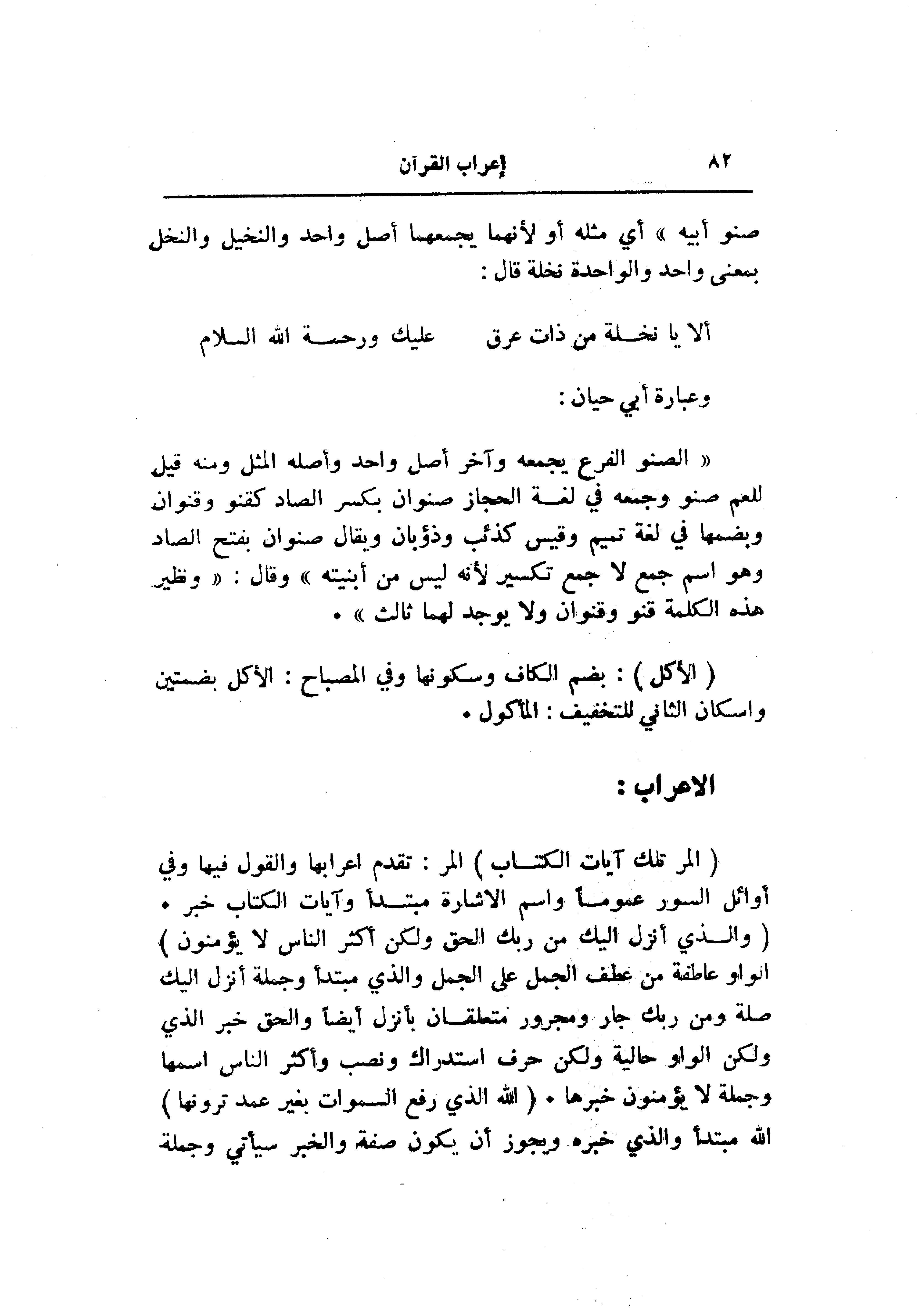 (وَالَّذِي أُنْزِلَ إِلَيْكَ مِنْ رَبِّكَ الْحَقُّ وَلكِنَّ أَكْثَرَ النَّاسِ لا يُؤْمِنُونَ) الواو عاطفة من عطف الجمل على الجمل والذي مبتدأ وجملة أنزل إليك صلة ومن ربك جار ومجرور متعلقان بأنزل أيضا والحق خبر الذي ولكن الواو حالية ولكن حرف استدراك ونصب وأكثر الناس اسمها وجملة لا يؤمنون خبرها. (اللَّهُ الَّذِي رَفَعَ السَّماواتِ بِغَيْرِ عَمَدٍ تَرَوْنَها) الله مبتدأ والذي خبره ويجوز أن يكون صفة والخبر سيأتي وجملة