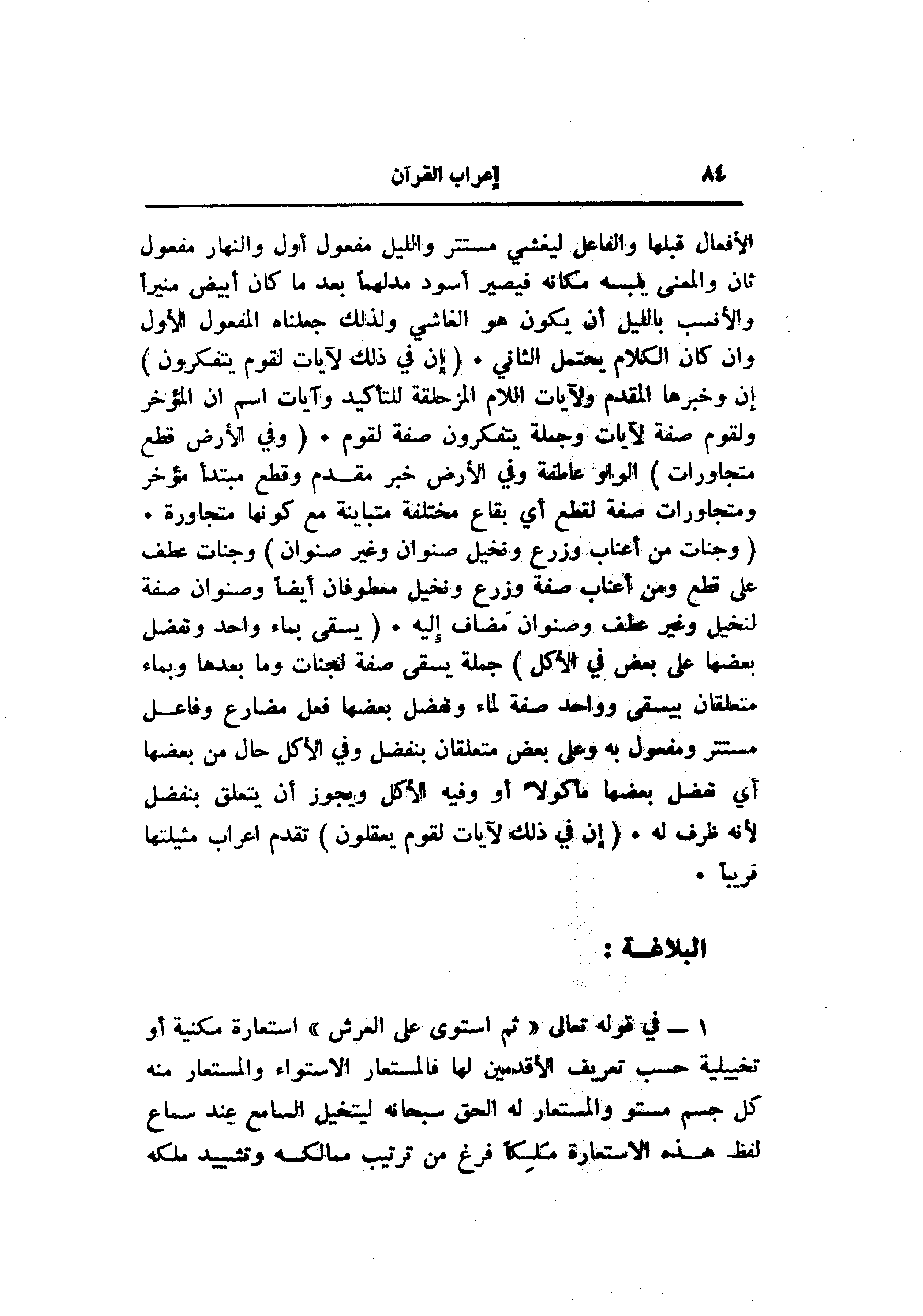 1- في قوله تعالى «ثم استوى على العرش» استعارة مكنية أو تخييلية حسب تعريف الأقدمين لها فالمستعار الاستواء والمستعار منه كل جسم مستو والمستعار له الحق سبحانه ليتخيل السامع عند سماع لفظ هذه الاستعارة ملكا فرغ من ترتيب ممالكه وتشييد ملكه