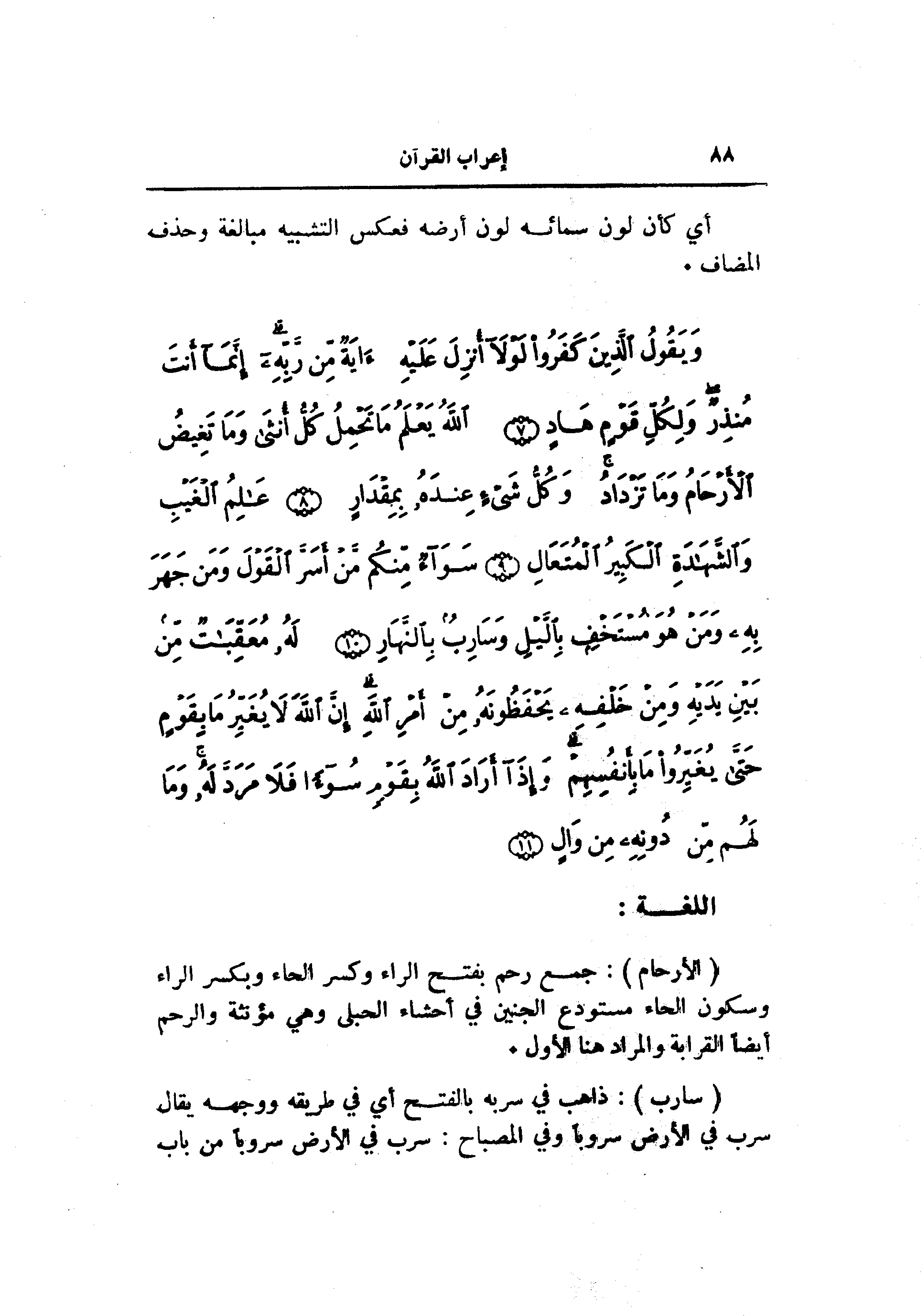 وَيَقُولُ الَّذِينَ كَفَرُوا لَوْلا أُنْزِلَ عَلَيْهِ آيَةٌ مِنْ رَبِّهِ إِنَّما أَنْتَ مُنْذِرٌ وَلِكُلِّ قَوْمٍ هادٍ (7) اللَّهُ يَعْلَمُ ما تَحْمِلُ كُلُّ أُنْثى وَما تَغِيضُ الْأَرْحامُ وَما تَزْدادُ وَكُلُّ شَيْءٍ عِنْدَهُ بِمِقْدارٍ (8) عالِمُ الْغَيْبِ وَالشَّهادَةِ الْكَبِيرُ الْمُتَعالِ (9) سَواءٌ مِنْكُمْ مَنْ أَسَرَّ الْقَوْلَ وَمَنْ جَهَرَ بِهِ وَمَنْ هُوَ مُسْتَخْفٍ بِاللَّيْلِ وَسارِبٌ بِالنَّهارِ (10) لَهُ مُعَقِّباتٌ مِنْ بَيْنِ يَدَيْهِ وَمِنْ خَلْفِهِ يَحْفَظُونَهُ مِنْ أَمْرِ اللَّهِ إِنَّ اللَّهَ لا يُغَيِّرُ ما بِقَوْمٍ حَتَّى يُغَيِّرُوا ما بِأَنْفُسِهِمْ وَإِذا أَرادَ اللَّهُ بِقَوْمٍ سُوْءاً فَلا مَرَدَّ لَهُ وَما لَهُمْ مِنْ دُونِهِ مِنْ والٍ (11)