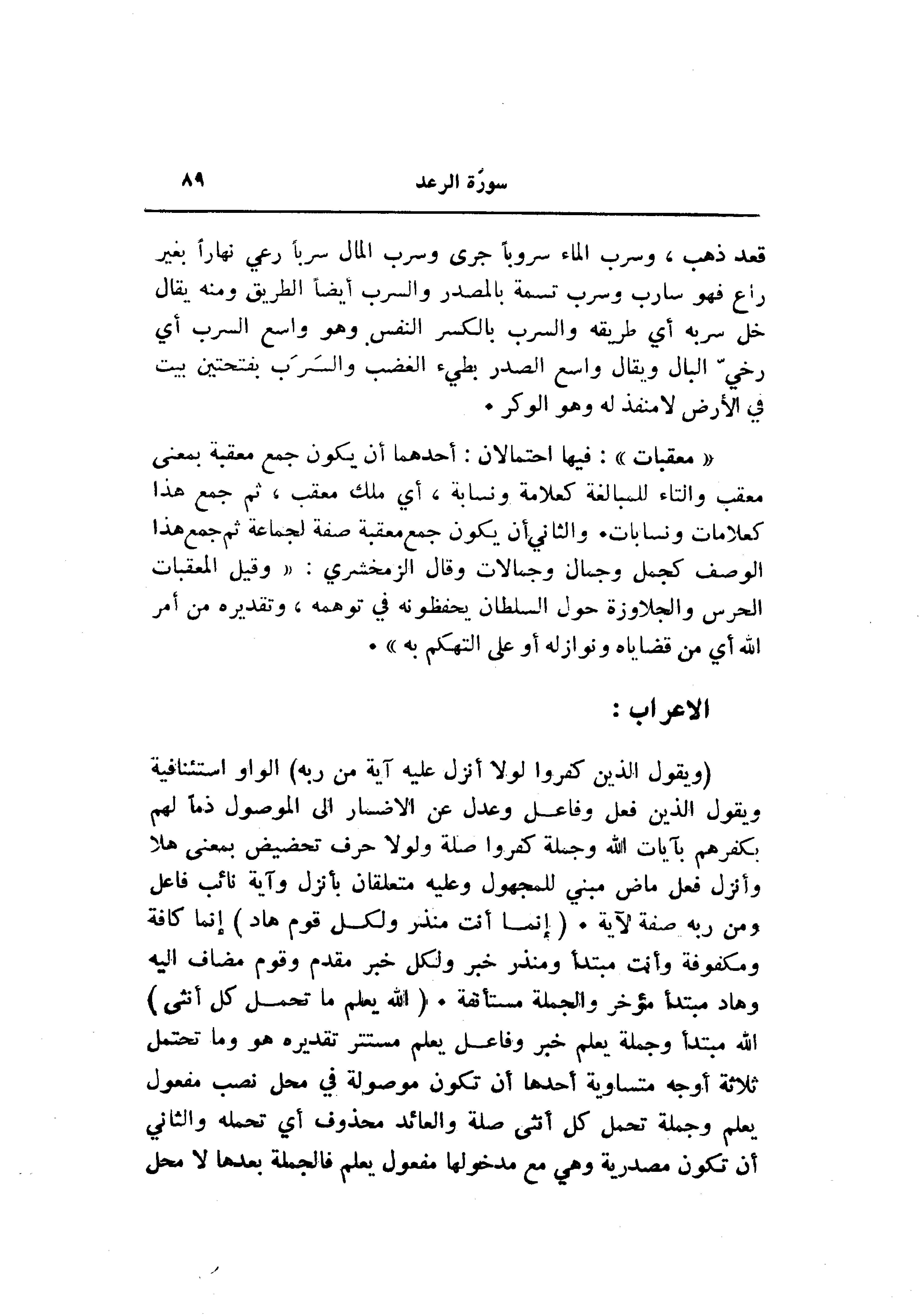 (وَيَقُولُ الَّذِينَ كَفَرُوا لَوْلا أُنْزِلَ عَلَيْهِ آيَةٌ مِنْ رَبِّهِ) الواو استئنافية ويقول الذين فعل وفاعل وعدل عن الإضمار الى الموصول ذما لهم بكفرهم بآيات الله وجملة كفروا صلة ولولا حرف تحضيض بمعنى هلا وأنزل فعل ماض مبني للمجهول وعليه متعلقان بأنزل وآية نائب فاعل ومن ربه صفة لآية. (إِنَّما أَنْتَ مُنْذِرٌ وَلِكُلِّ قَوْمٍ هادٍ) إنما كافة ومكفوفة وأنت مبتدأ ومنذر خبر ولكل خبر مقدم وقوم مضاف اليه وهاد مبتدأ مؤخر والجملة مستأنفة. (اللَّهُ يَعْلَمُ ما تَحْمِلُ كُلُّ أُنْثى) الله مبتدأ وجملة يعلم خبر وفاعل يعلم مستتر تقديره هو وما تحتمل ثلاثة أوجه متساوية أحدها أن تكون موصولة في محل نصب مفعول يعلم وجملة تحمل كل أنثى صلة والعائد محذوف أي تحمله والثاني أن تكون مصدرية وهي مع مدخولها مفعول يعلم فالجملة بعدها لا محل