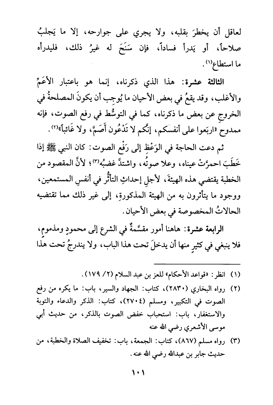 الثالثة عشرة: هذا الذي ذكرناه، إنَّما هو باعتبار الأعَمِّ والأغلب، وقد يقعُ في بعض الأحيان ما يُوجِب أن يكونَ المصلحةُ في الخروجِ عن بعض ما ذكرناه، كما في التوسُّط في رفع الصوت، فإنَّه ممدوح "اربَعوا على أنفسكم، إنَّكم لا تَدْعُون أَصَمَّ، ولا غَائباً" (¬2).