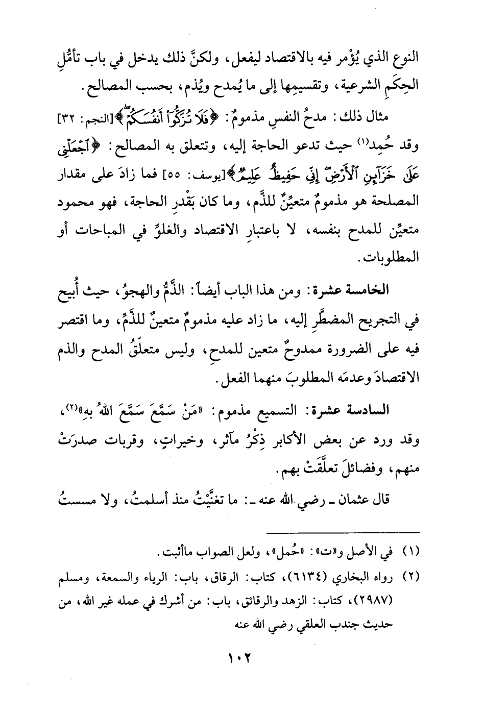 الخامسة عشرة: ومن هذا الباب أيضًا: الذَّمُّ والهجوُ، حيث أُبيح في التجريح المضطَّرِ إليه، ما زاد عليه مذمومٌ متعينٌ للذَّمِّ، وما اقتصر فيه على الضرورة ممدوحٌ متعين للمدحِ، وليس متعلّقُ المدح والذم الاقتصادَ وعدمَه المطلوبَ منهما الفعل.