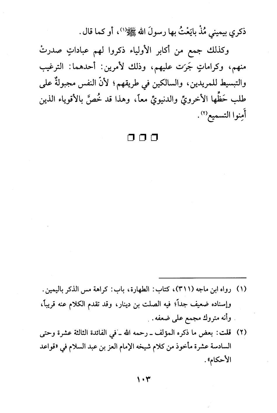 وكذلك جمع من أكابر الأولياء ذكروا لهم عباداتٍ صدرتْ منهم، وكراماتٍ جَرَت عليهم، وذلك لأمرين: أحدهما: الترغيب والتبسيط للمريدين، والسالكين في طريقهم؛ لأنّ النفس مجبولةٌ على طلب حَظِّها الأخروي والدنيويِّ معًا، وهذا قد خُصَّ بالأقوياء الذين أَمِنوا التسميع (¬2).