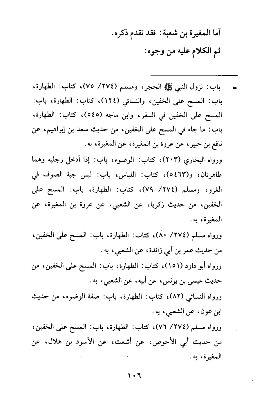 = باب: نزول النبي - صلى الله عليه وسلم - الحجر، ومسلم (274/ 75)، كتاب: الطهارة، باب: المسح على الخفين، والنسائي (124)، كتاب: الطهارة، باب: المسح على الخفين في السفر، وابن ماجه (545)، كتاب: الطهارة، باب: ما جاء في المسح على الخفين، من حديث سعد بن إبراهيم، عن نافع بن حبير، عن عروة بن المغيرة، عن المغيرة، به.