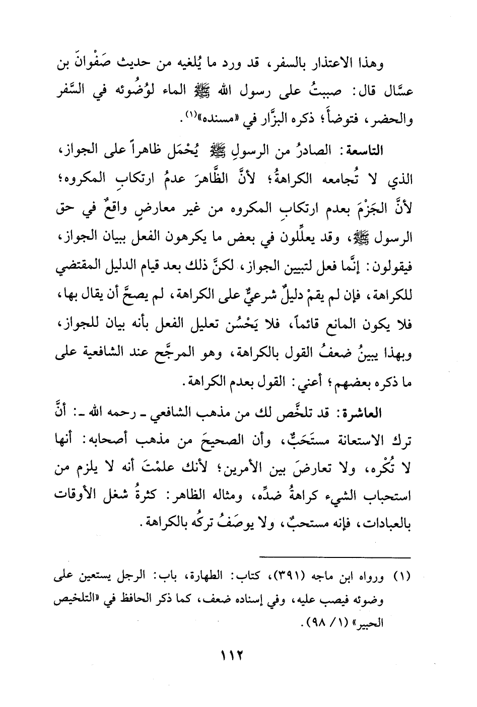 التاسعة: الصادرُ من الرسولِ - صلى الله عليه وسلم - يُحْمَل ظاهرًا على الجواز، الذي لا تُجامعه الكراهةُ؛ لأنَّ الظَّاهرَ عدمُ ارتكابِ المكروه؛ لأنَّ الجَزْمَ بعدم ارتكابِ المكروه من غير معارضٍ واقعٌ في حق الرسول - صلى الله عليه وسلم -، وقد يعلِّلون في بعض ما يكرهون الفعل ببيان الجواز، فيقولون: إنَّما فعل لتبيين الجواز، لكنَّ ذلك بعد قيام الدليل المقتضي للكراهة، فإن لم يقمْ دليلٌ شرعيٌّ على الكراهة، لم يصحَّ أن يقال بها، فلا يكون المانع قائمًا، فلا يَحْسُن تعليل الفعل بأنه بيان للجواز، وبهذا يبينُ ضعفُ القول بالكراهة، وهو المرجَّح عند الشافعية على ما ذكره بعضهم؛ أعني: القول بعدم الكراهة.