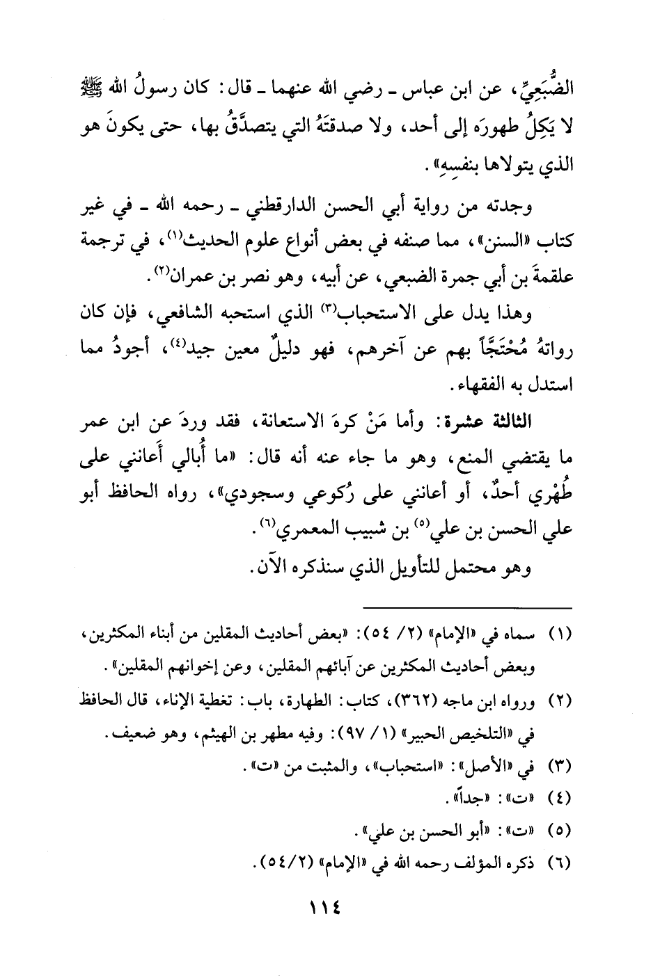الضُّبَعِيِّ، عن ابن عباس - رضي الله عنهما - قال: كان رسولُ الله - صلى الله عليه وسلم - لا يَكِلُ طهورَه إلى أحد، ولا صدقتَهُ التي يتصدَّقُ بها، حتى يكونَ هو الذي يتولاها بنفسِهِ".