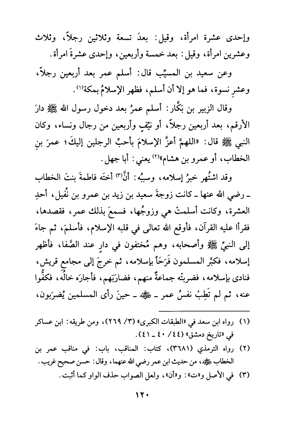 وقال الزبير بن بَكَّار: أسلم عمرُ بعد دخول رسول الله - صلى الله عليه وسلم - دارَ الأرقم، بعد أربعين رجلًا، أو نيِّفٍ وأربعين من رجال ونساء، وكان النبي - صلى الله عليه وسلم - قال: "اللهمَّ أعزَّ الإسلامَ بأحبِّ الرجلين إليكَ؛ عمرَ بنِ الخطاب، أو عمرو بن هشام" (¬2) يعني: أبا جهل.