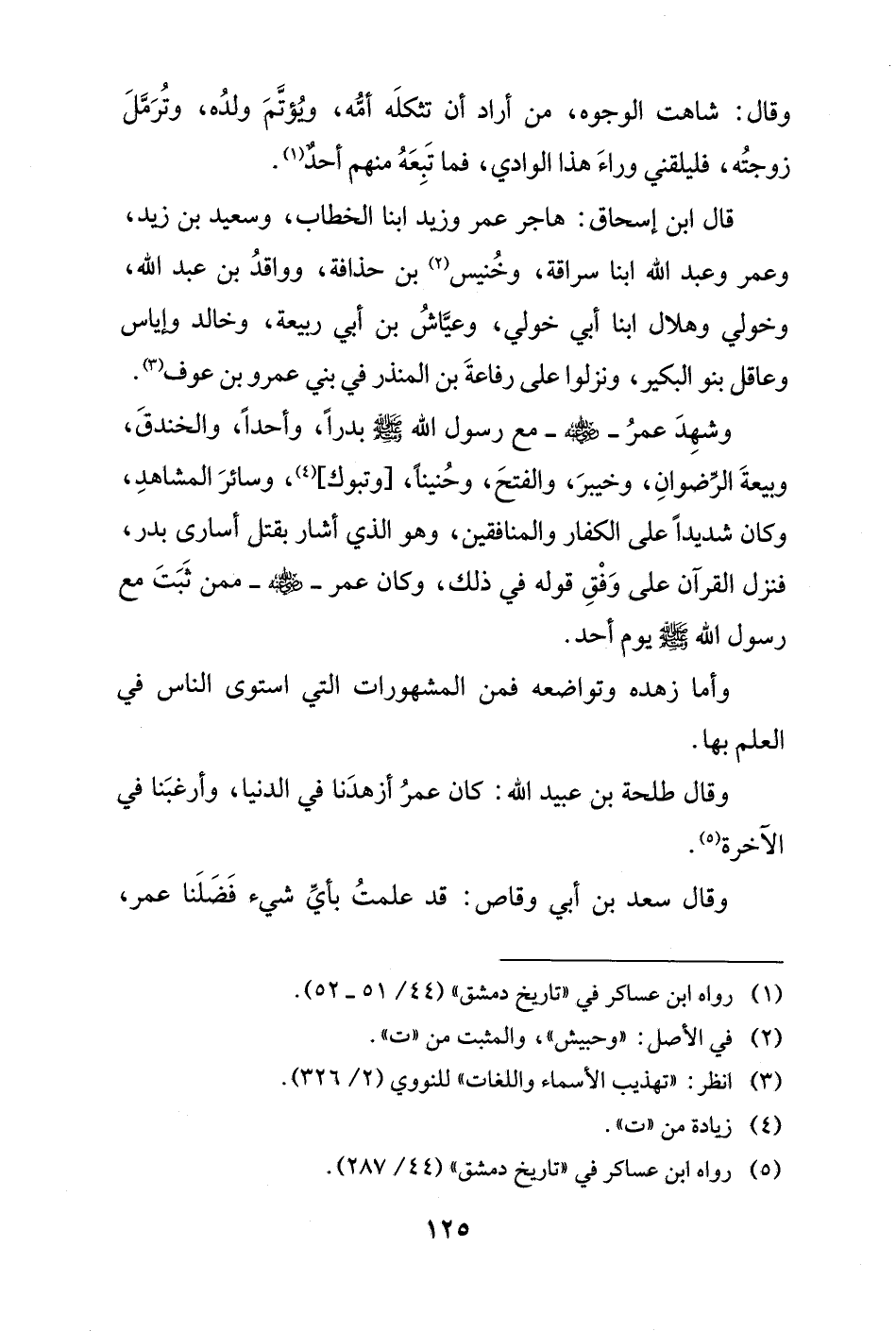 وشهِدَ عمرُ - رضي الله عنه - مع رسول الله - صلى الله عليه وسلم - بدرًا، وأحدًا، والخندقَ، وبيعةَ الرِّضوانِ، وخيبرَ، والفتحَ، وحُنينًا، [وتبوك] (¬4)، وسائرَ المشاهدِ، وكان شديدًا على الكفار والمنافقين، وهو الذي أشار بقتل أسارى بدر، فنزل القرآن على وَفْقِ قوله في ذلك، وكان عمر - رضي الله عنه - ممن ثَبَتَ مع رسول الله - صلى الله عليه وسلم - أحد.