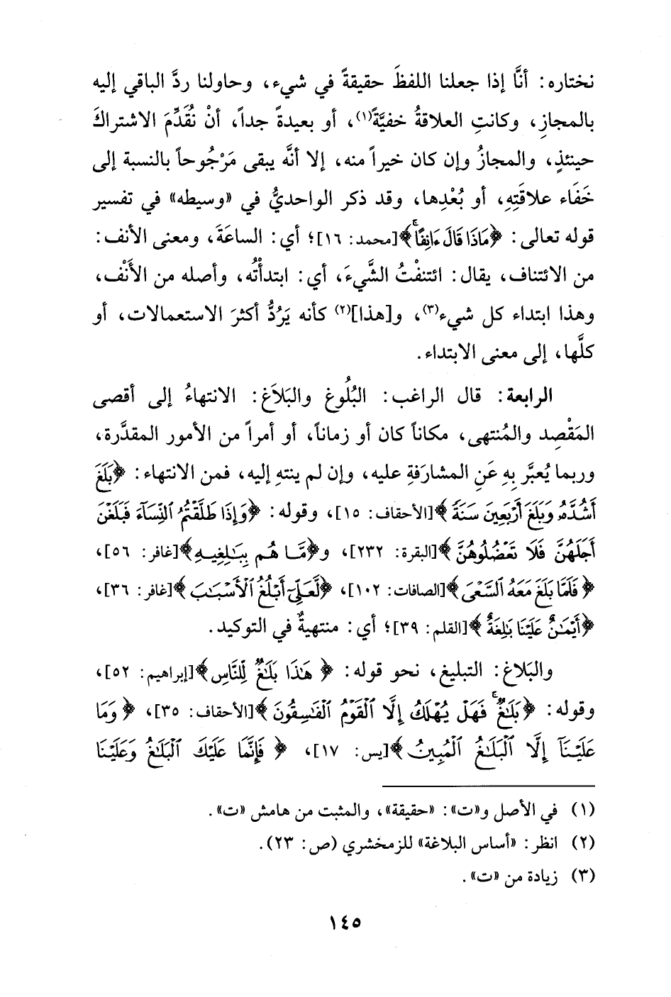 الرابعة: قال الراغب: البُلُوغ والبَلاع: الانتهاءُ إلى أقصى المَقْصِد والمُنتهى، مكانًا كان أو زمانًا، أو أمرًا من الأمور المقدَّرة، وربما يُعبَّر بِهِ عَنِ المشارَفةِ عليه، وإن لم ينتهِ إليه، فمن الانتهاء: {بَلَغَ أَشُدَّهُ وَبَلَغَ أَرْبَعِينَ سَنَةً} [الأحقاف: 15]، وقوله: {وَإِذَا طَلَّقْتُمُ النِّسَاءَ فَبَلَغْنَ أَجَلَهُنَّ فَلَا تَعْضُلُوهُنَّ} [البقرة: 232]، و {مَا هُمْ بِبَالِغِيهِ} [غافر: 56]، {فَلَمَّا بَلَغَ مَعَهُ السَّعْيَ} [الصافات: 102]، {لَعَلِّي أَبْلُغُ الْأَسْبَابَ} [غافر: 36]، {أَيْمَانٌ عَلَيْنَا بَالِغَةٌ} [القلم: 39]؛ أي: منتهيةٌ في التوكيد.