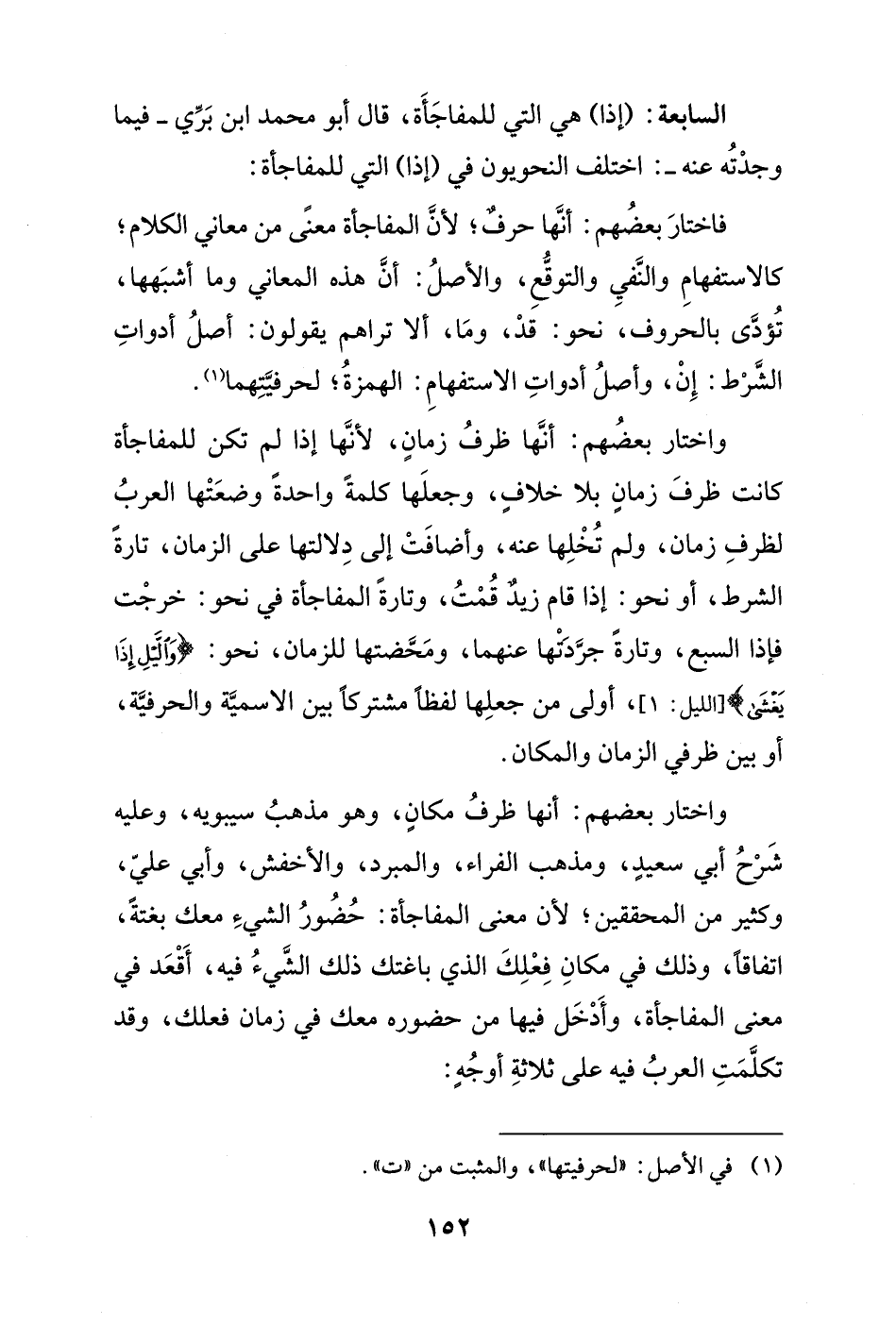 السابعة: (إذا) هي التي للمفاجَأَة، قال أبو محمد ابن بَرِّي - فيما وجدْتُه عنه -: اختلف النحويون في (إذا) التي للمفاجأة: فاختارَ بعضُهم: أنَّها حرفٌ؛ لأنَّ المفاجأة معنَى من معاني الكلام؛ كالاستفهامِ والنَّفيِ والتوقُّعِ، والأصلُ: أنَّ هذه المعاني وما أشبَهها، تُؤدَّى بالحروف، نحو: قدْ، ومَا، ألا تراهم يقولون: أصلُ أدواتِ الشَّرْط: إِنْ، وأصلُ أدواتِ الاستفهامِ: الهمزةُ؛ لحرفيَّتِهما (¬1).