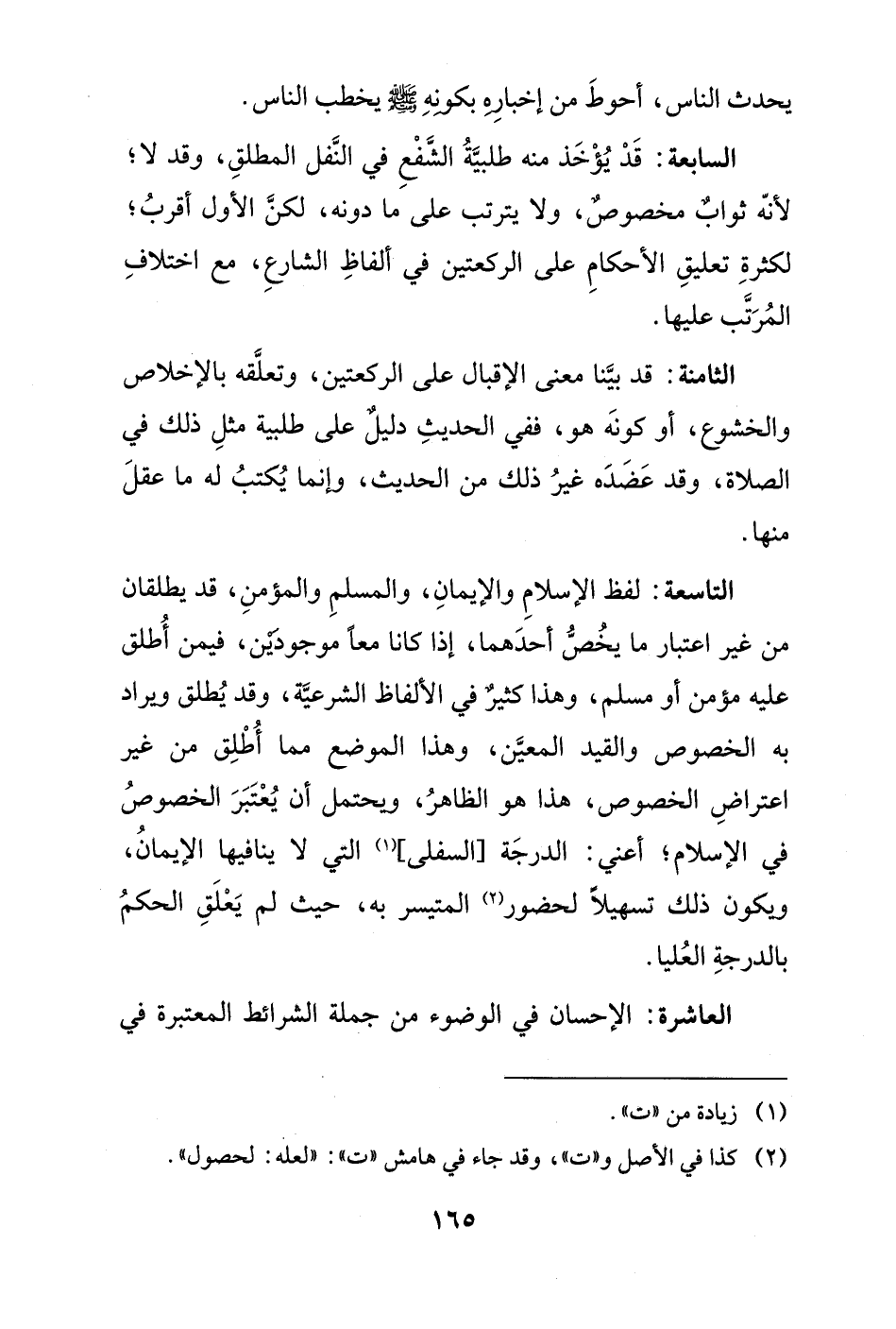 التاسعة: لفظ الإسلامِ والإيمانِ، والمسلمِ والمؤمنِ، قد يطلقان من غير اعتبار ما يخُصُّ أحدَهما، إذا كانا معاً موجودَيْن، فيمن أُطلق عليه مؤمن أو مسلم، وهذا كثيرٌ في الألفاظ الشرعيَّة، وقد يُطلق ويراد به الخصوص والقيد المعيَّن، وهذا الموضع مما أُطْلِق من غير اعتراضِ الخصوص، هذا هو الظاهرُ، ويحتمل أن يُعْتَبَرَ الخصوصُ في الإسلام؛ أعني: الدرجَة [السفلى] (¬1) التي لا ينافيها الإيمانُ، ويكون ذلك تسهيلاً لحضور (¬2) المتيسر به، حيث لم يَعْلَقِ الحكمُ بالدرجةِ العُليا.