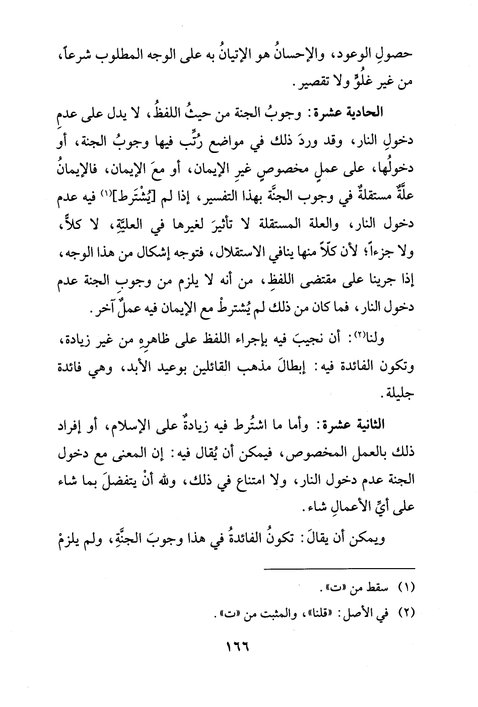 الثانية عشرة: وأما ما اشتُرط فيه زيادةٌ على الإسلام، أو إفراد ذلك بالعمل المخصوص، فيمكن أن يُقال فيه: إن المعنى مع دخول الجنة عدم دخول النار، ولا امتناع في ذلك، ولله أنْ يتفضلَ بما شاء على أيِّ الأعمالِ شاء.