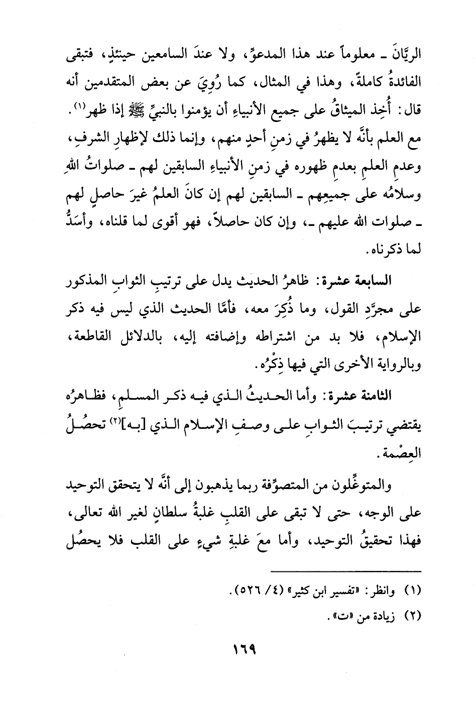السابعة عشرة: ظاهرُ الحديث يدل على ترتيبِ الثوابِ المذكور على مجرَّدِ القول، وما ذُكِرَ معه، فأمَّا الحديث الذي ليس فيه ذكر الإسلام، فلا بد من أشتراطه وإضافته إليه، بالدلائل القاطعة، وبالرواية الأخرى التي فيها ذِكْرُه.