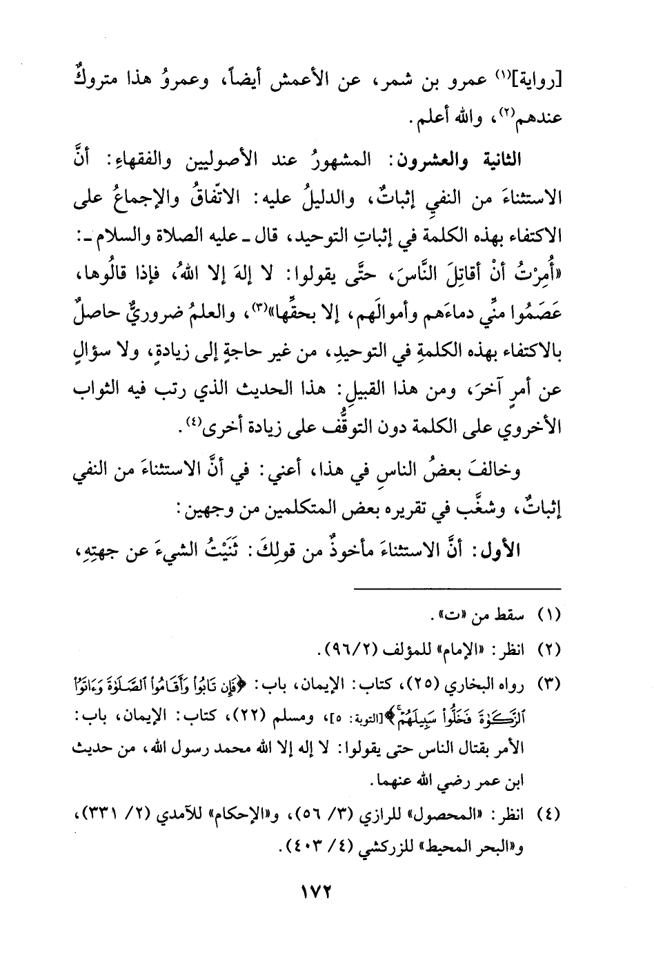 الثانية والعشرون: المشهورُ عند الأصوليين والفقهاءِ: أنَّ الاستثناءَ من النفيِ إثباتٌ، والدليلُ عليه: الاتّفاقُ والإجماعُ على الاكتفاء بهذه الكلمة في إثباتِ التوحيد، قال - عليه الصلاة والسلام -: "أُمِرْتُ أنْ أقاتِلَ النَّاسَ، حتَّى يقولوا: لا إلهَ إلا اللهُ، فإذا قالُوها، عَصَمُوا منِّي دماءَهم وأموالَهم، إلا بحقِّها" (¬3)، والعلمُ ضروريٌّ حاصلٌ بالاكتفاء بهذه الكلمةِ في التوحيدِ، من غير حاجةٍ إلى زيادةٍ، ولا سؤالٍ عن أمرٍ آخرَ، ومن هذا القبيلِ: هذا الحديث الذي رتب فيه الثواب الأخروي على الكلمة دون التوقُّف على زيادة أخرى (¬4).