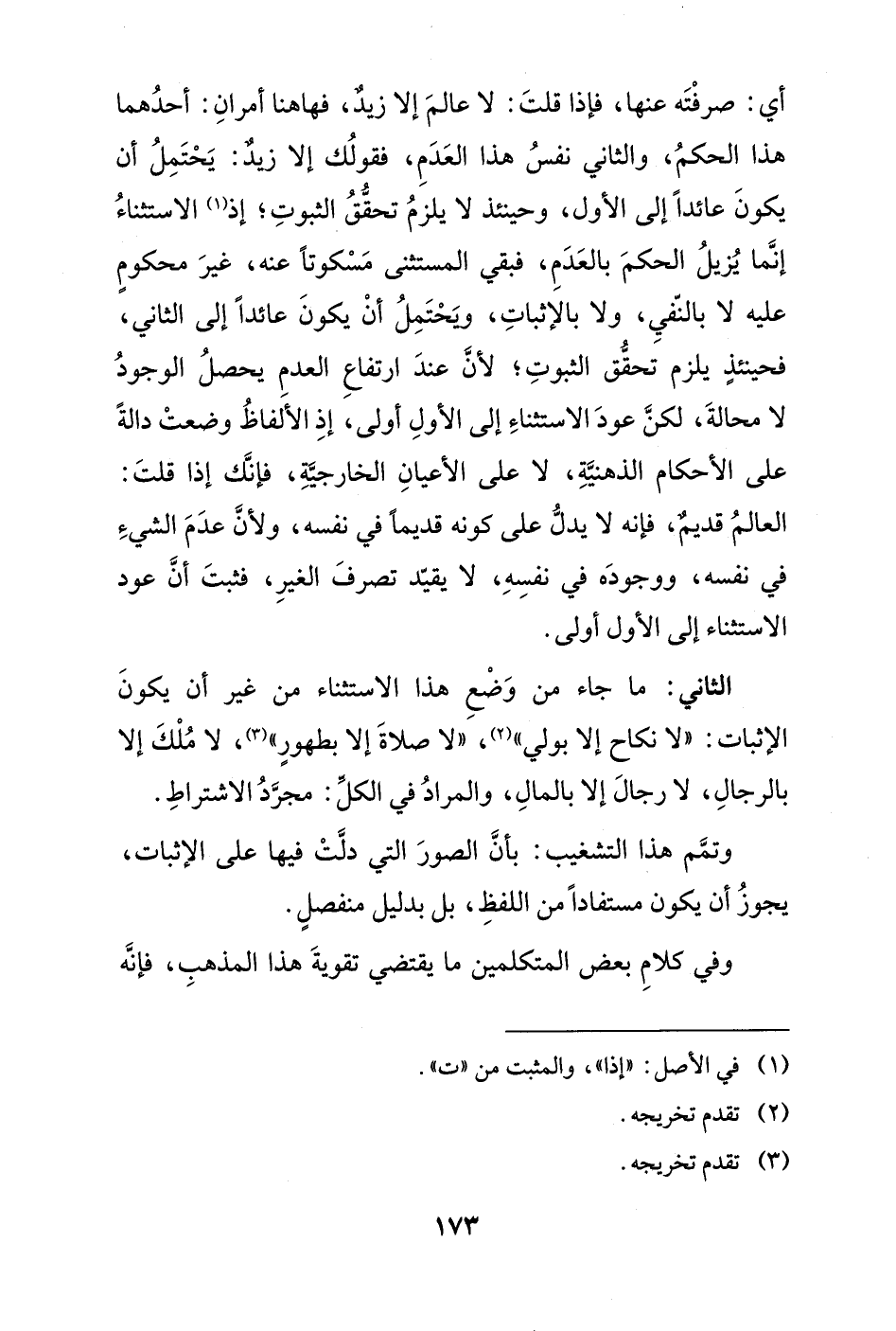 أي: صرفْتَه عنها، فإذا قلتَ: لا عالمَ إلا زيدٌ، فهاهنا أمرانِ: أحدُهما هذا الحكمُ، والثاني نفسُ هذا العَدَمِ، فقولُك إلا زيدٌ: يَحْتَمِلُ أن يكونَ عائداً إلى الأول، وحينئذ لا يلزمُ تحقُّقُ الثبوتِ؛ إذ (¬1) الاستثناءُ إنَّما يُزيلُ الحكمَ بالعَدَمِ، فبقي المستثنى مَسْكوتًا عنه، غيرَ محكومٍ عليه لا بالنّفيِ، ولا بالإثباتِ، ويَحْتَمِلُ أنْ يكونَ عائداً إلى الثاني، فحينئذٍ يلزم تحقُّق الثبوتِ؛ لأنَّ عندَ ارتفاعِ العدمِ يحصلُ الوجودُ لا محالةَ، لكنَّ عودَ الاستثناءِ إلى الأولِ أولى، إذِ الألفاظُ وضعتْ دالة على الأحكام الذهنيَّةِ، لا على الأعيانِ الخارجيَّةِ، فإنَّك إذا قلتَ: العالمُ قديمٌ، فإنه لا يدلُّ على كونه قديماً في نفسه، ولأنَّ عدَمَ الشيءِ في نفسه، ووجودَه في نفسِهِ، لا يقيّد تصرفَ الغيرِ، فثبتَ أنَّ عود الاستثناء إلى الأول أولى.