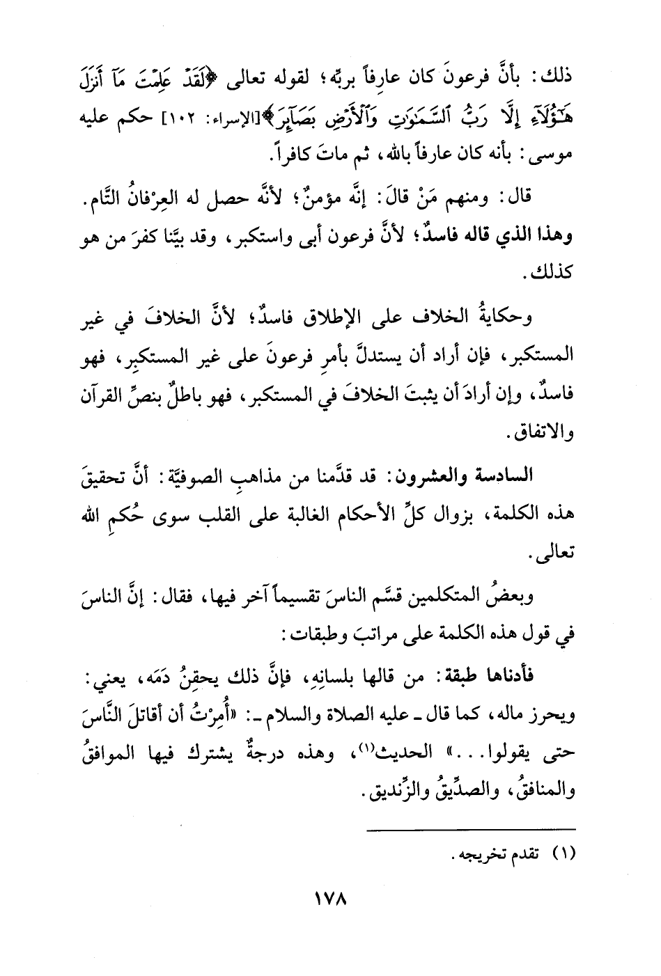 قال: ومنهم مَنْ قالَ: إنَّه مؤمنٌ؛ لأنَّه حصل له العِرْفانُ التَّام. وهذا الذي قاله فاسدٌ؛ لأنَّ فرعون أبى واستكبر، وقد بيَّنا كفرَ من هو كذلك.