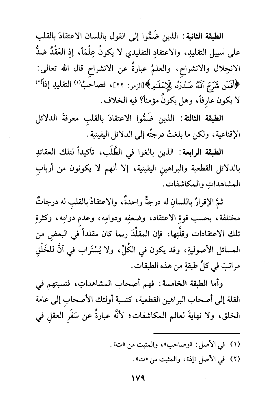 الطبقة الثانية: الذين ضَمُّوا إلى القول باللسان الاعتقادَ بالقلب على سبيل التقليدِ، والاعتقادِ التقليدي لا يكونُ عِلْمًا، إذِ العَقْدُ ضدُّ الانحِلال والانشراحِ، والعلمُ عبارةٌ عن الانشراحِ قال الله تعالى: {أَفَمَنْ شَرَحَ اللَّهُ صَدْرَهُ لِلْإِسْلَامِ} [الزمر: 22]، فصاحبُ (¬1) التقليدِ إذاً (¬2) لا يكون عارِفاً، وهل يكونُ مؤمناً؟ فيه الخلاف.