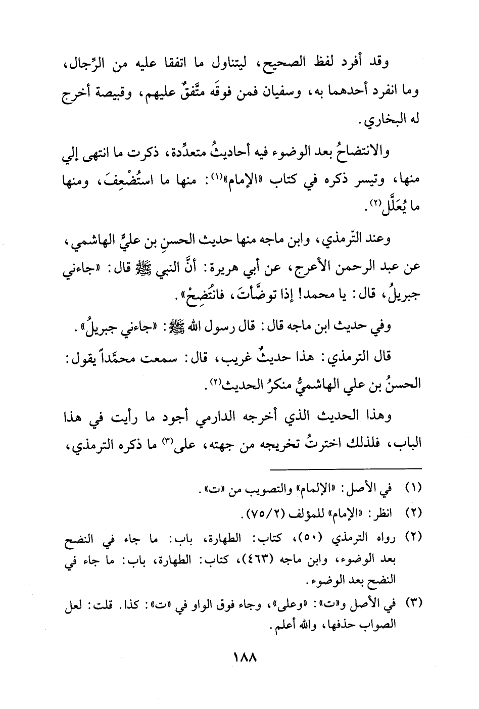 وعند التّرمذي، وابن ماجه منها حديث الحسنِ بن عليٍّ الهاشمي، عن عبد الرحمن الأعرج، عن أبي هريرة: أنَّ النبي - صلى الله عليه وسلم - قال: "جاءني جبريلُ، قال: يا محمد! إذا توضَّأتَ، فانْتَضِحْ".