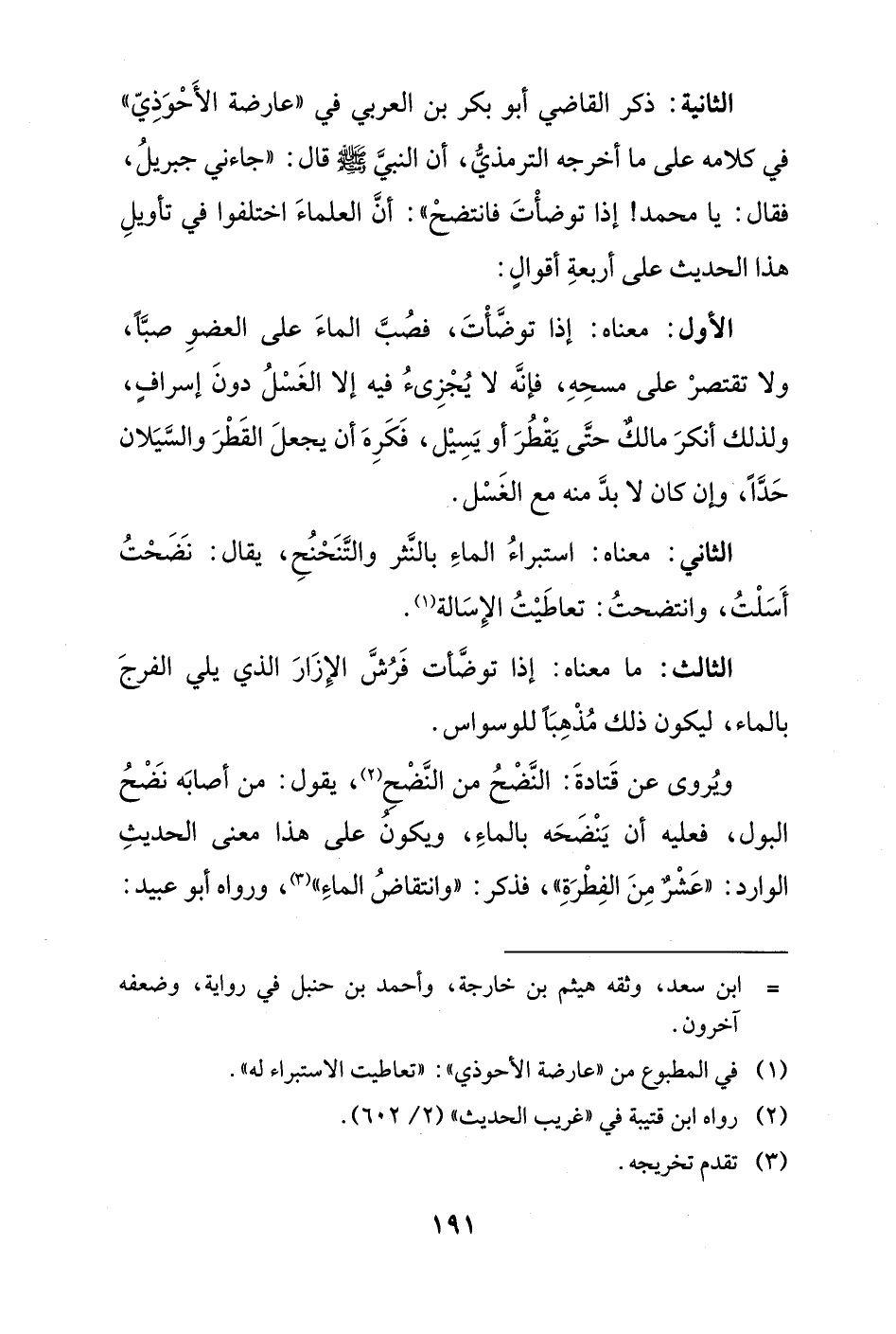 الثانية: ذكر القاضي أبو بكر بن العربي في "عارضة الأَحْوَذِيّ" في كلامه على ما أخرجه الترمذيُّ، أن النبيَّ - صلى الله عليه وسلم - قال: "جاءني جبريلُ، فقال: يا محمد! إذا توضأْتَ فانتضحْ": أنَّ العلماءَ اختلفوا في تأويلِ هذا الحديث على أربعةِ أقوالٍ: