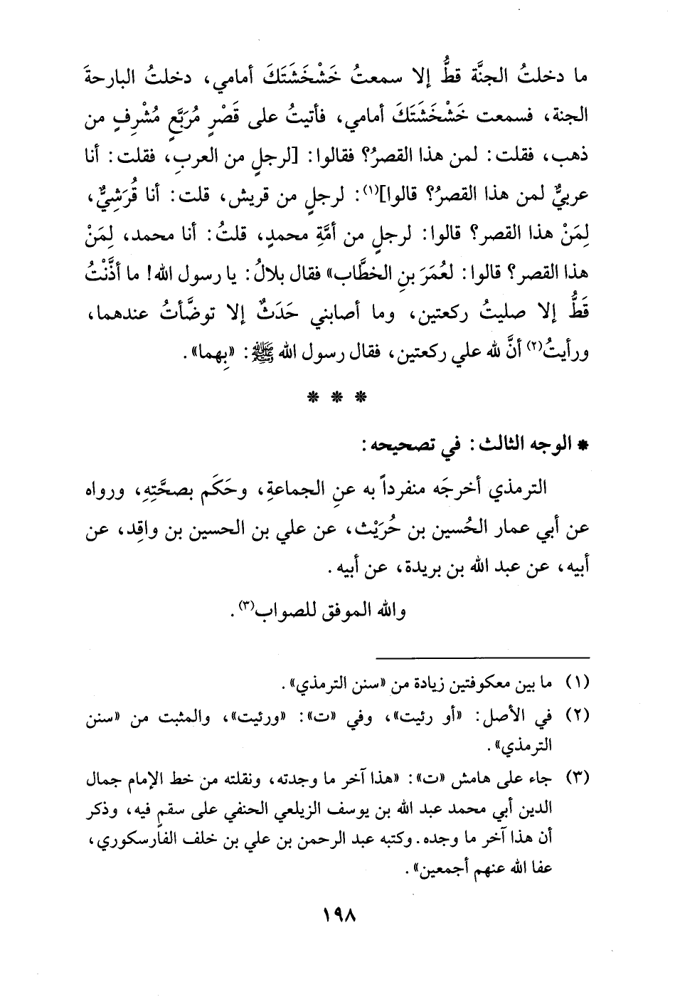 ما دخلتُ الجنَّة قطُّ إلا سمعتُ خَشْخَشَتَكَ أمامي، دخلتُ البارحةَ الجنة، فسمعت خَشْخَشَتَكَ أمامي، فأتيتُ على قَصْر مُرَبَّعٍ مُشْرِفٍ من ذهب، فقلت: لمن هذا القصرُ؟ فقالوا: [لرجل من العربِ، فقلت: أنا عربيٌّ لمن هذا القصرُ؟ قالوا] (¬1): لرجلٍ من قريش، قلت: أنا قُرَشِيٌّ، لِمَنْ هذا القصر؟ قالوا: لرجل من أمَّةِ محمدٍ، قلتُ: أنا محمد، لِمَنْ هذا القصر؟ قالوا: لعُمَرَ بنِ الخطَّاب" فقال بلالُ: يا رسول الله! ما أذَّنْتُ قَطُّ إلا صليتُ ركعتين، وما أصابني حَدَثٌ إلا توضَّأتُ عندهما، ورأيتُ (¬2) أنَّ لله علي ركعتين، فقال رسول الله - صلى الله عليه وسلم -: "بِهما".