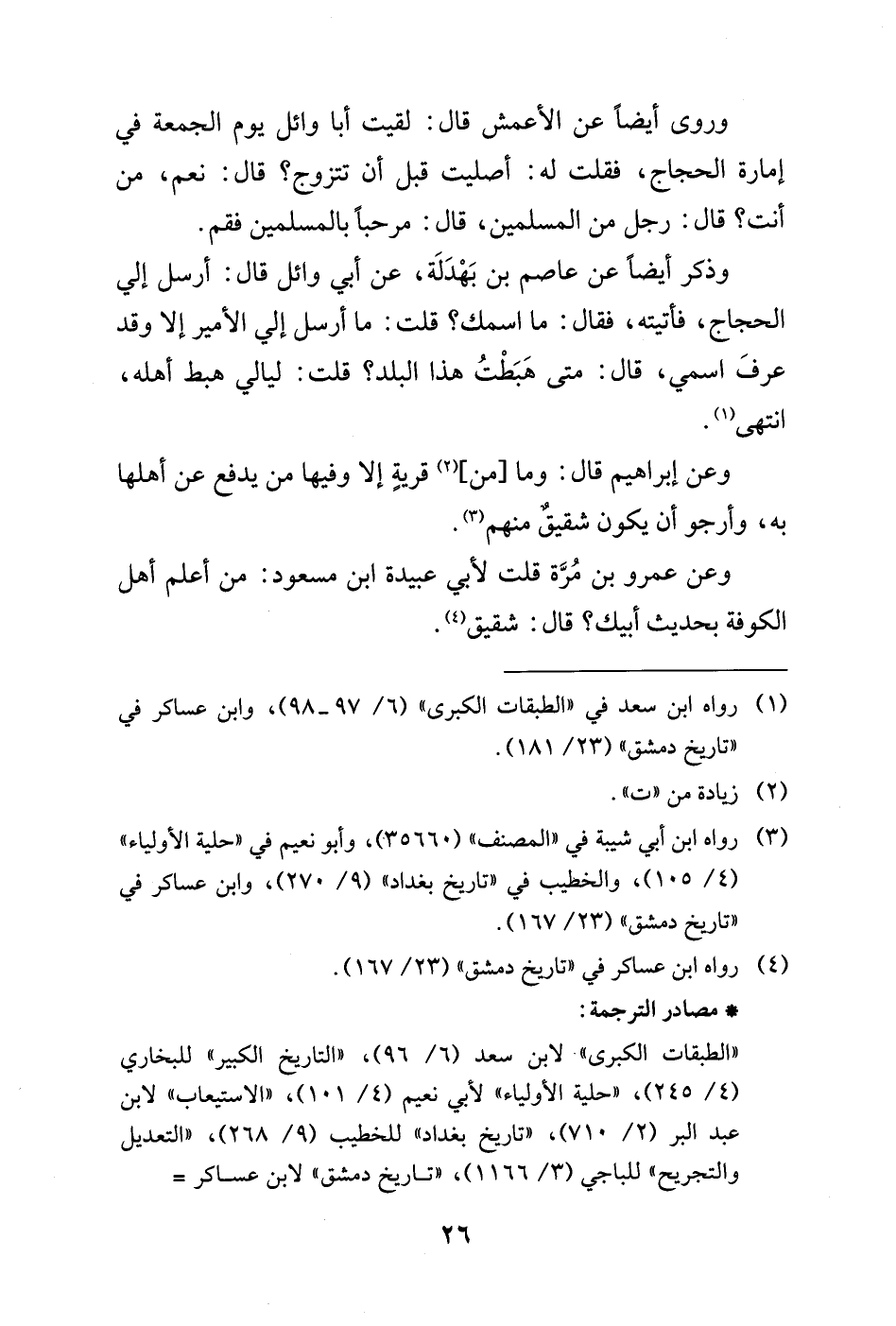 وعن عمرو بن مُرَّة قلت لأبي عبيدة ابن مسعود: من أعلم أهل الكوفة بحديث أبيك؟ قال: شقيق (¬4).